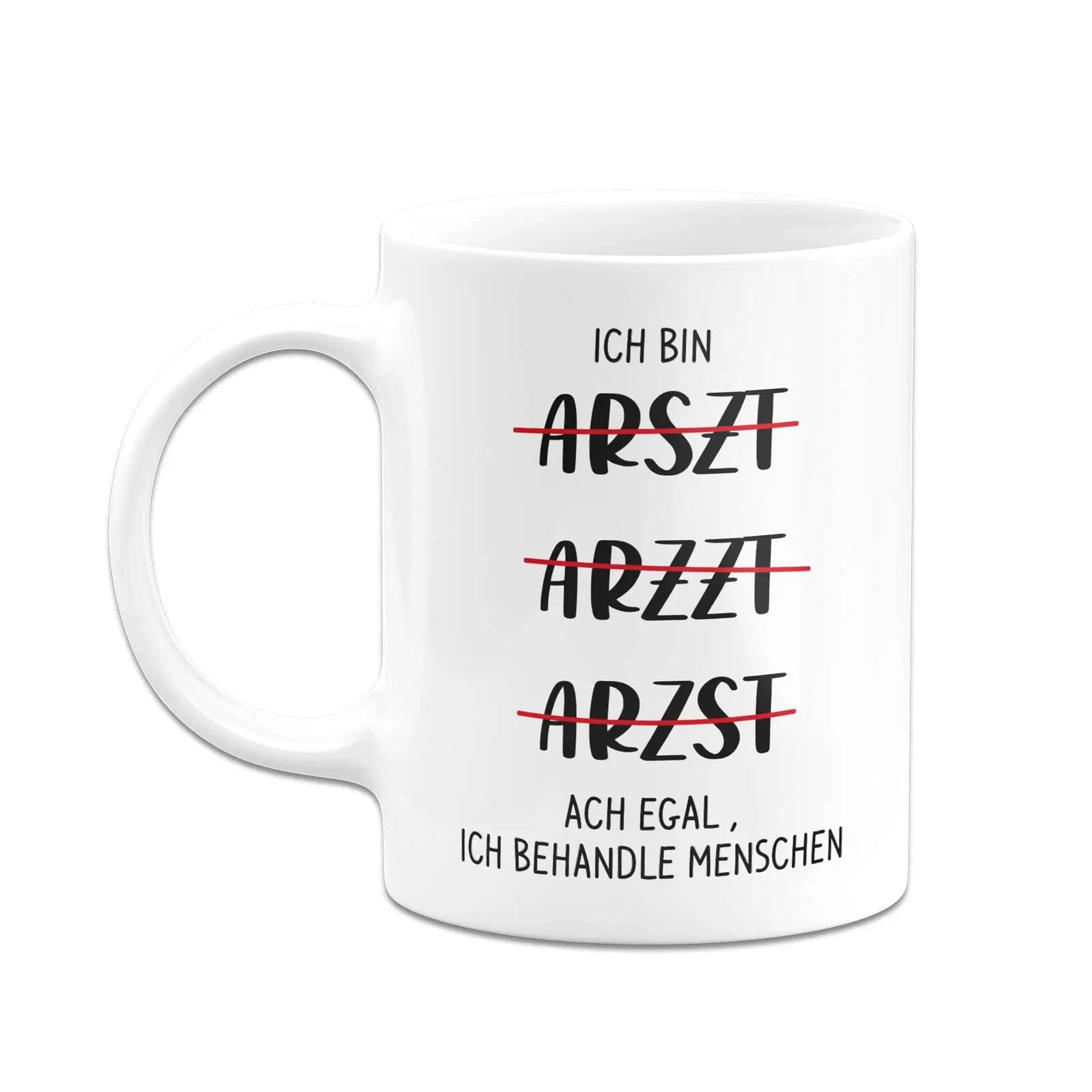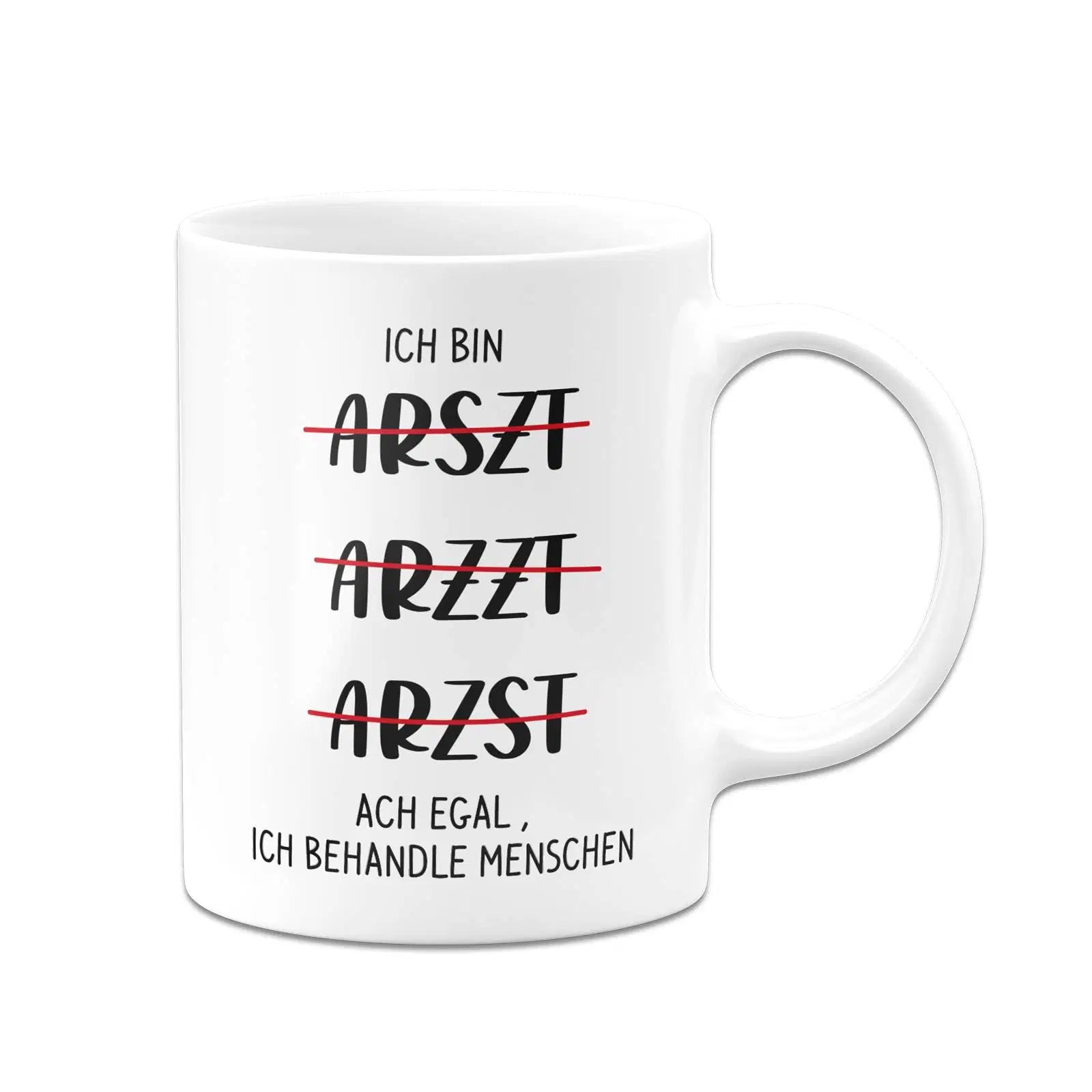 Tasse für Ärzte mit Spruch: Ich bin Arszt, Arzzt, Arzst - ach egal, ich behandle Menschen