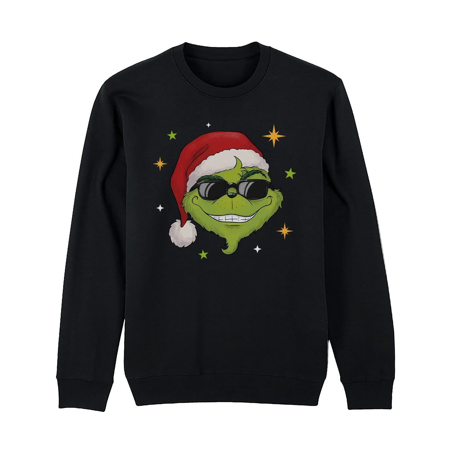 Das Motiv bringt alles auf den Punkt: lässig, ironisch, cool. Umgeben von kleinen Sternen ist dieser Grinch einfach der King der Weihnachtszeit – und du gleich mit ihm.