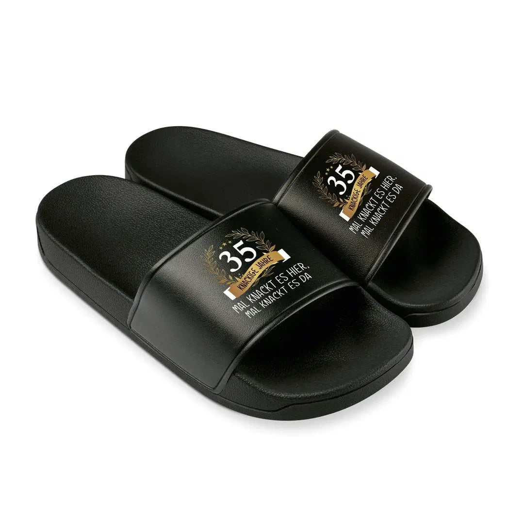 Entdecke unsere stilvollen Badeschuhe, ideal für Herren und Damen. Sie sind nicht nur komfortabel und funktional, sondern bringen auch eine ordentliche Portion Humor mit. Auf jedem Schuh prangt der Spruch: "Mal knackt es hier, mal knackt es da - [Zahl] - knackige Jahre", was sie zum idealen Geburtstagsgeschenk zum 35., 45., 55., 65. oder 75. Geburtstag macht.