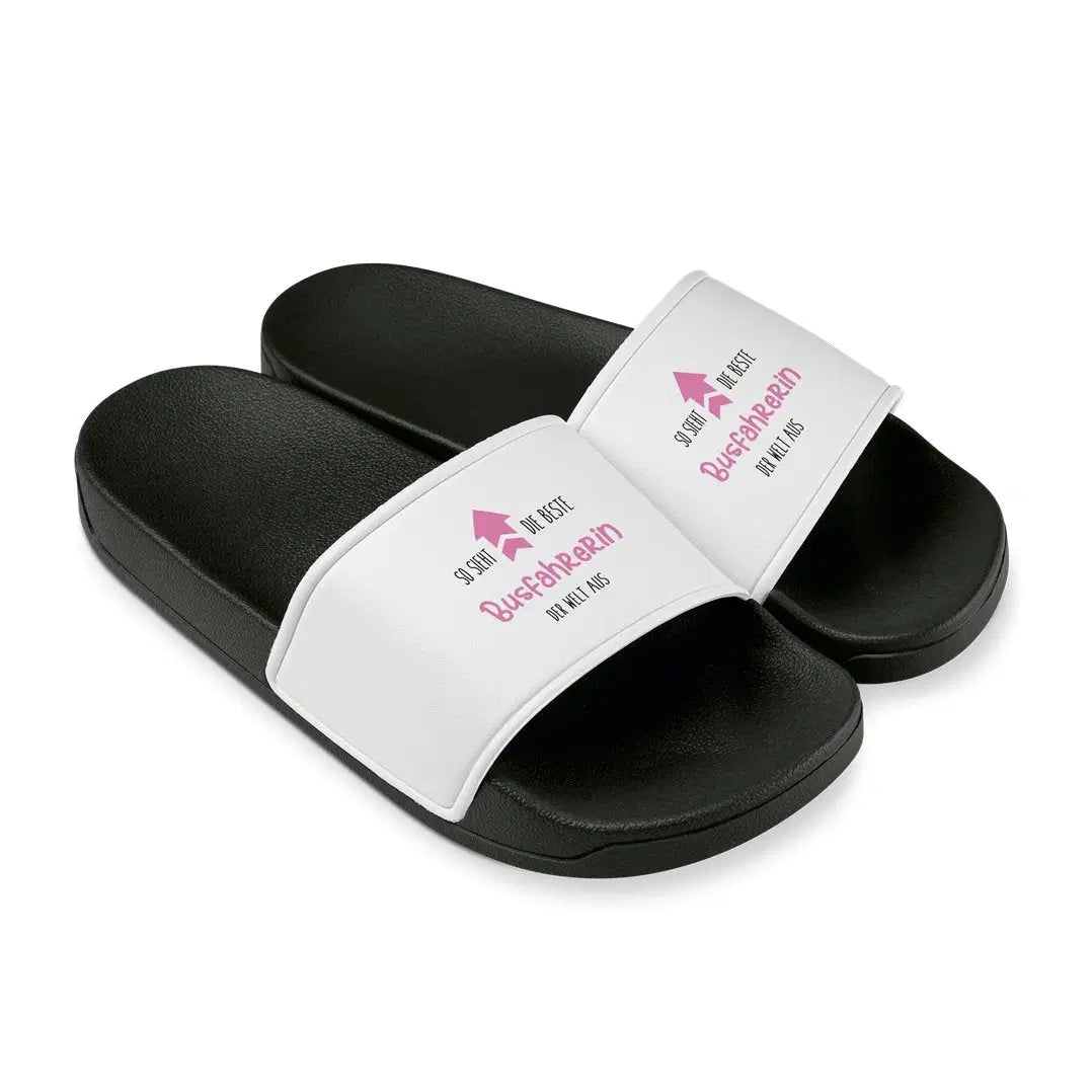 Badeschuhe mit dem Spruch: So sieht die beste Busfahrerin der Welt aus.