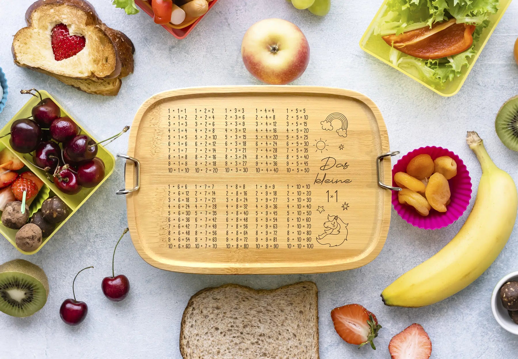 Die passenden Frühstücksbrettchen gibt es auch bei uns: Frühstücksbrettchen - Das kleine 1x1 - Roboter/Einhorn