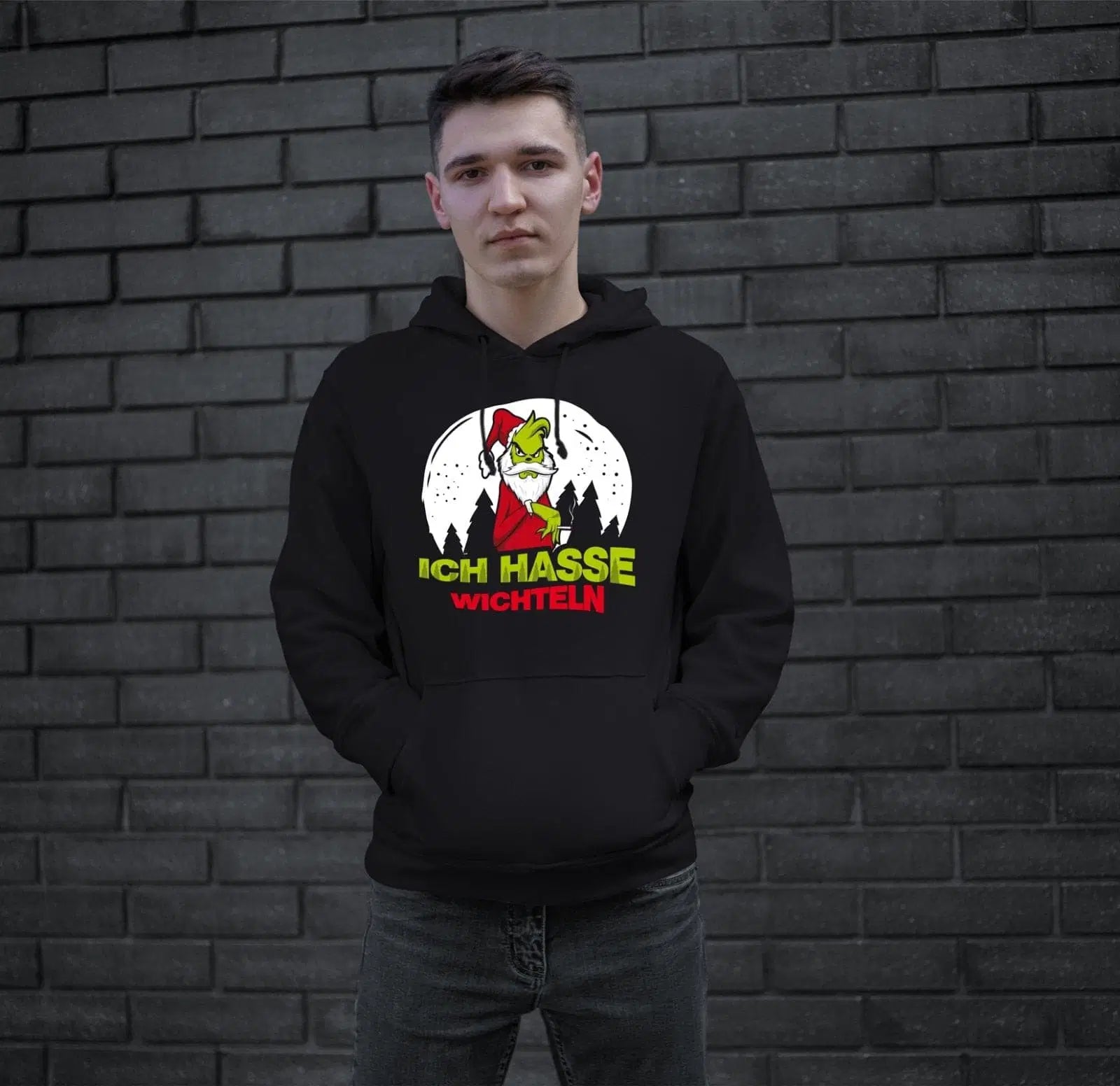 Hochwertiger Hoodie / Pullover mit Kapuze mit Grinch Motiv und Spruch: Ich hasse Wichteln 🌲
