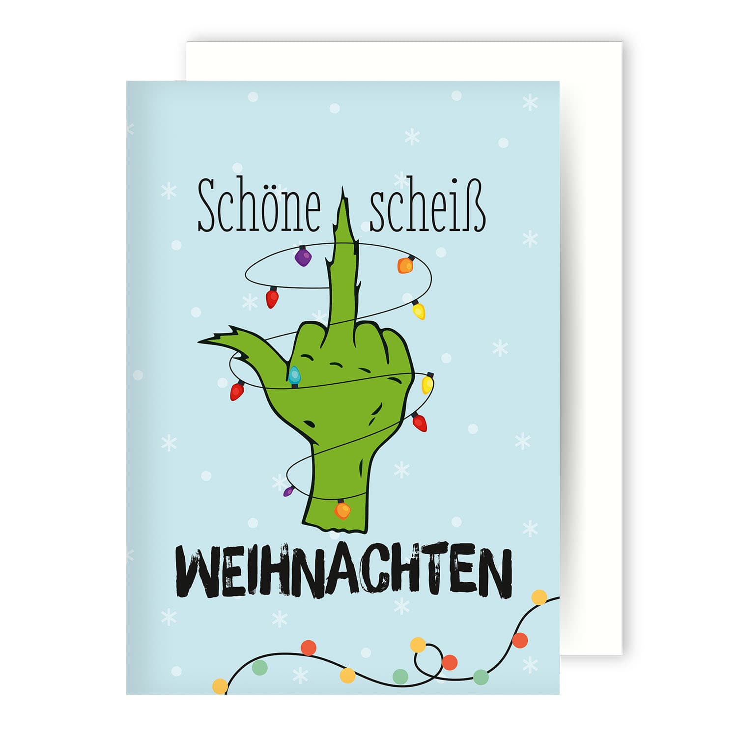 Diese Karte ist nichts für Weihnachtsromantiker, aber perfekt für alle mit Sinn für schwarzen Humor! Die Weihnachtskarte „Schöne scheiß Weihnachten“ bringt genau die richtige Portion Ironie unter den Baum. Das Motiv zeigt eine grüne Hand mit bunter Lichterkette, die charmant den Mittelfinger hebt – ein augenzwinkerndes Statement für alle, die den Weihnachtsstress lieber mit Humor nehmen.