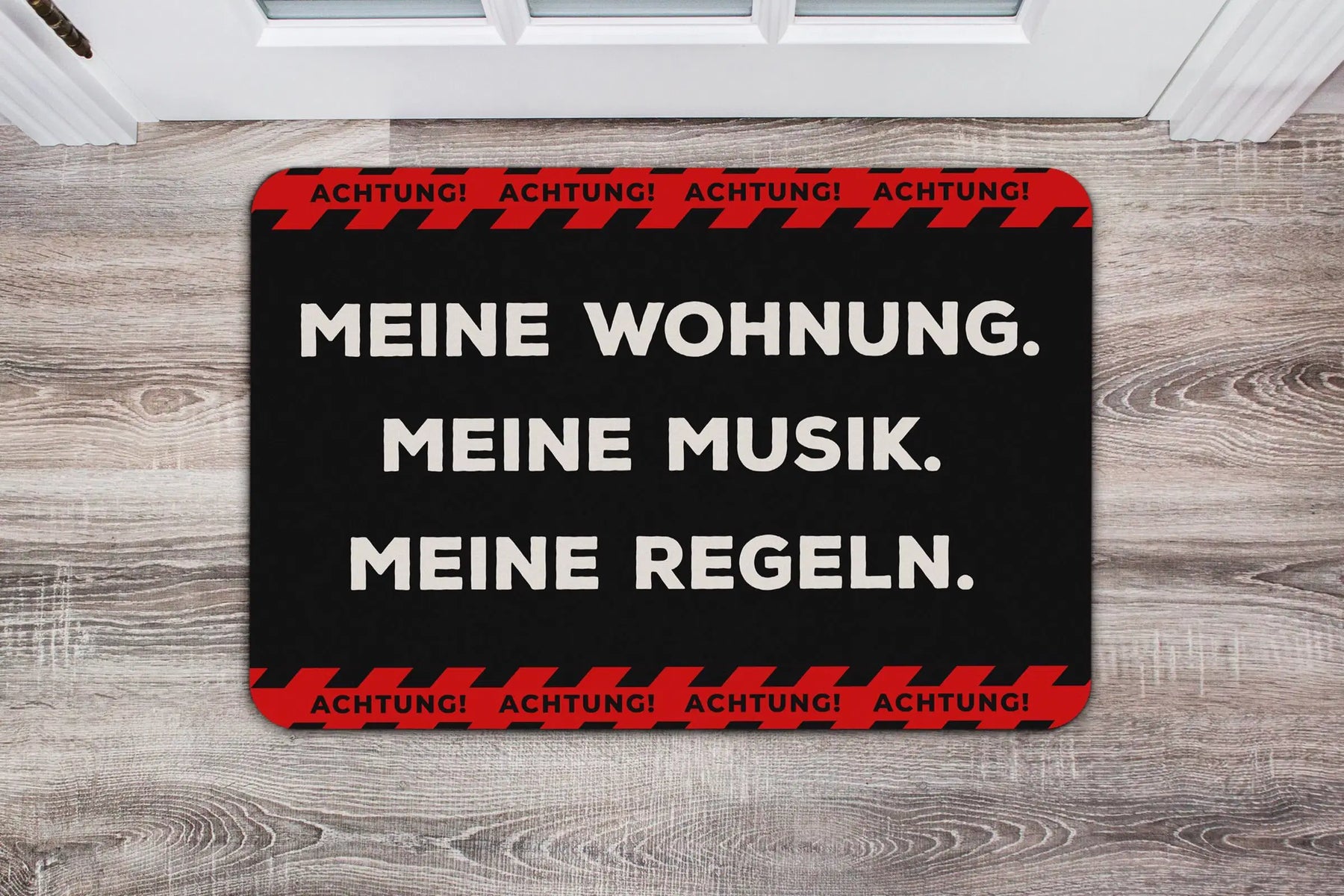 Fußmatte mit Spruch: Achtung! Meine Wohnung. Meine Musik. Meine Regeln.