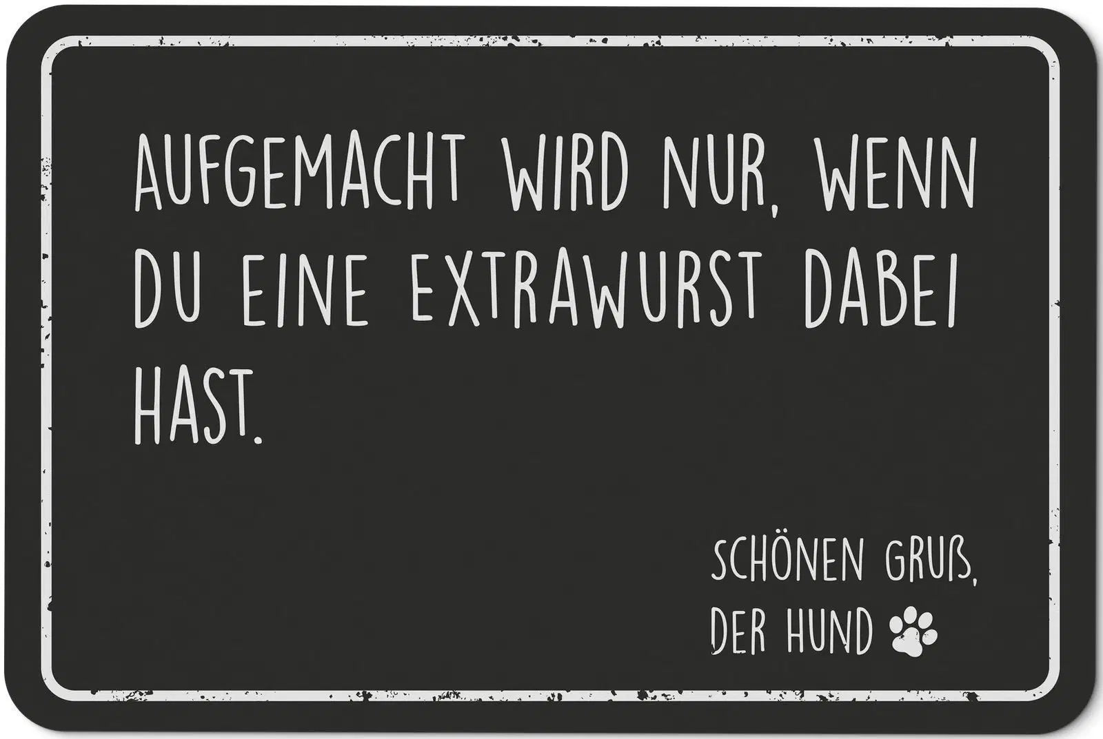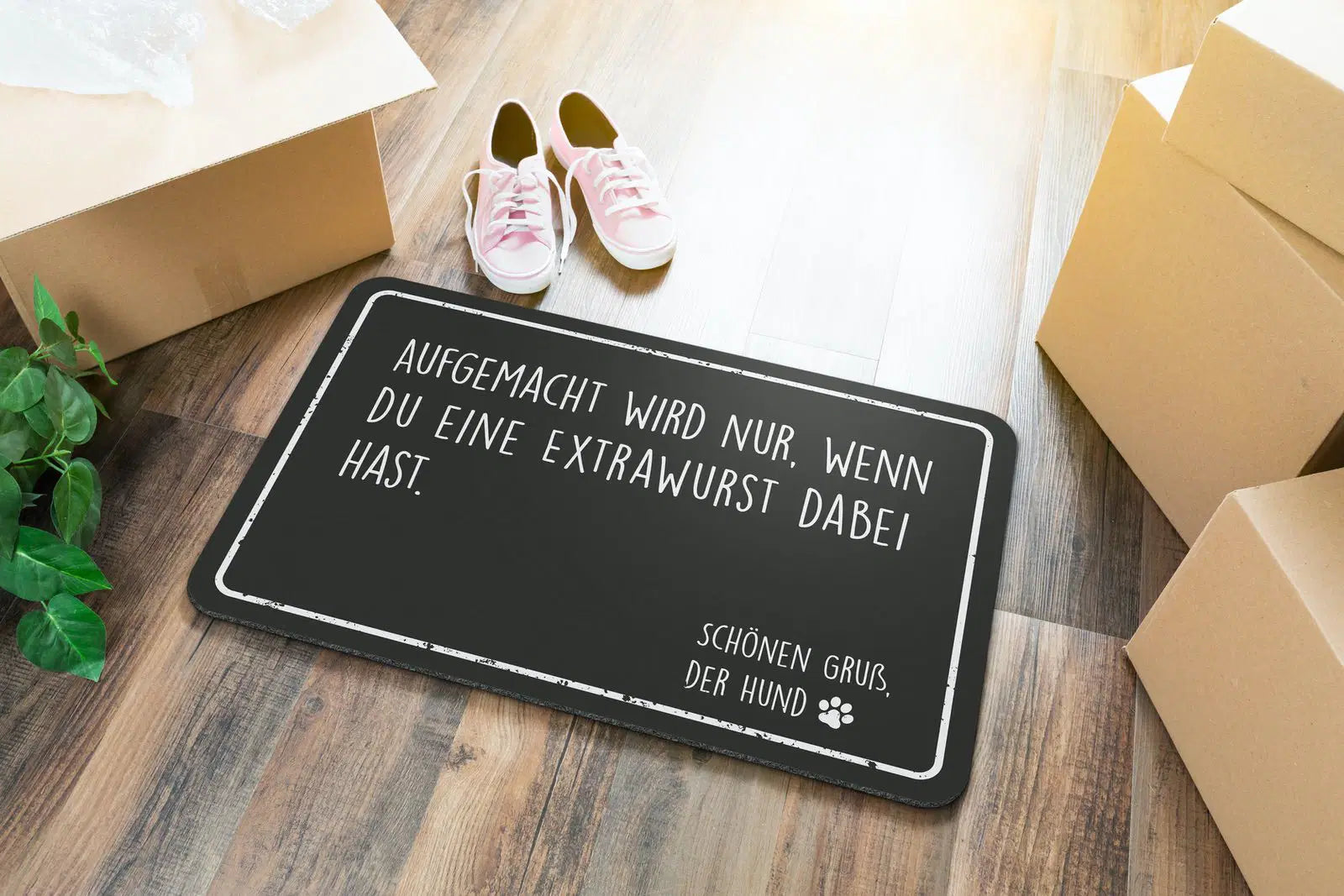 Fußmatte mit Spruch: Aufgemacht wird nur, wenn Du eine Extrawurst dabei hast. Schönen Gruß, der Hund 🐾