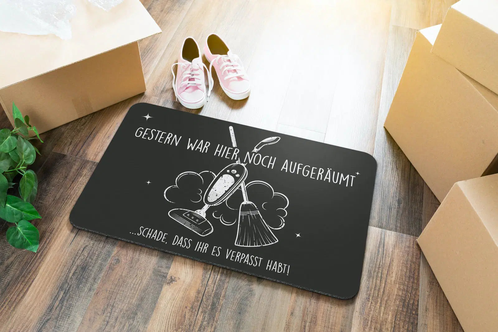 Fußmatte mit Spruch: Gestern war hier noch aufgeräumt. 💨 Schade, dass ihr es verpasst habt!
