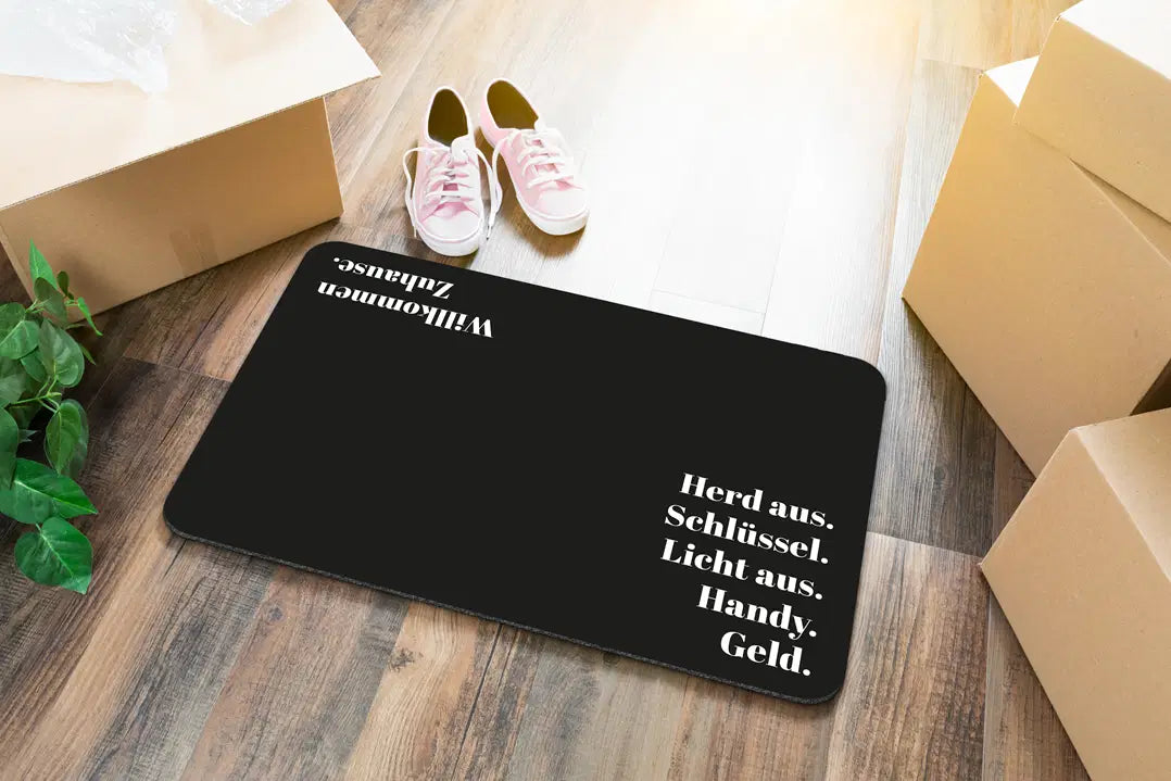Fußmatte mit Spruch: Willkommen Zuhause. - Herd aus. Schlüssel. Licht aus. Handy. Geld.