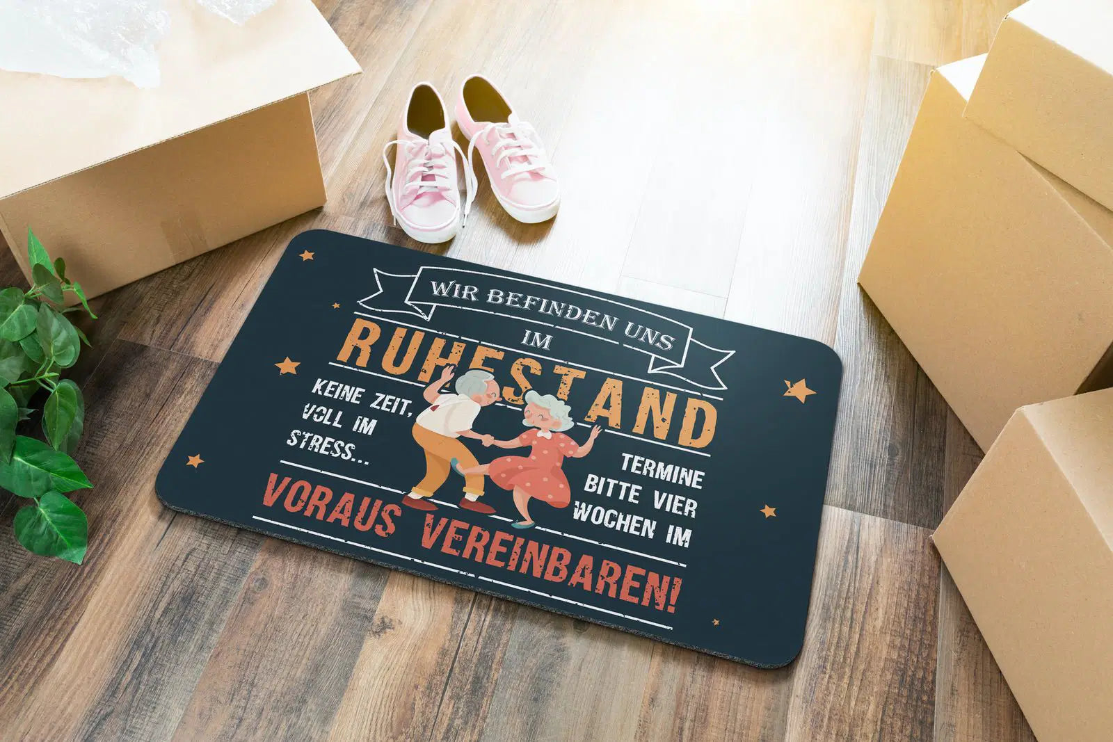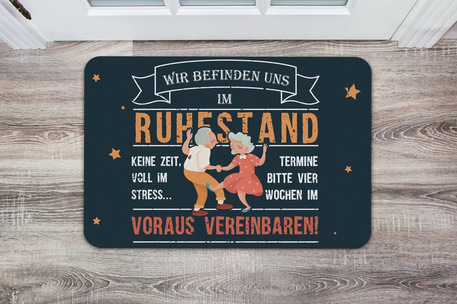 Lustige Fußmatte mit Spruch: Wir befinden uns im Ruhestand ⭐ Keine Zeit, voll im Stress. Termine bitte Wochen im voraus vereinbaren!