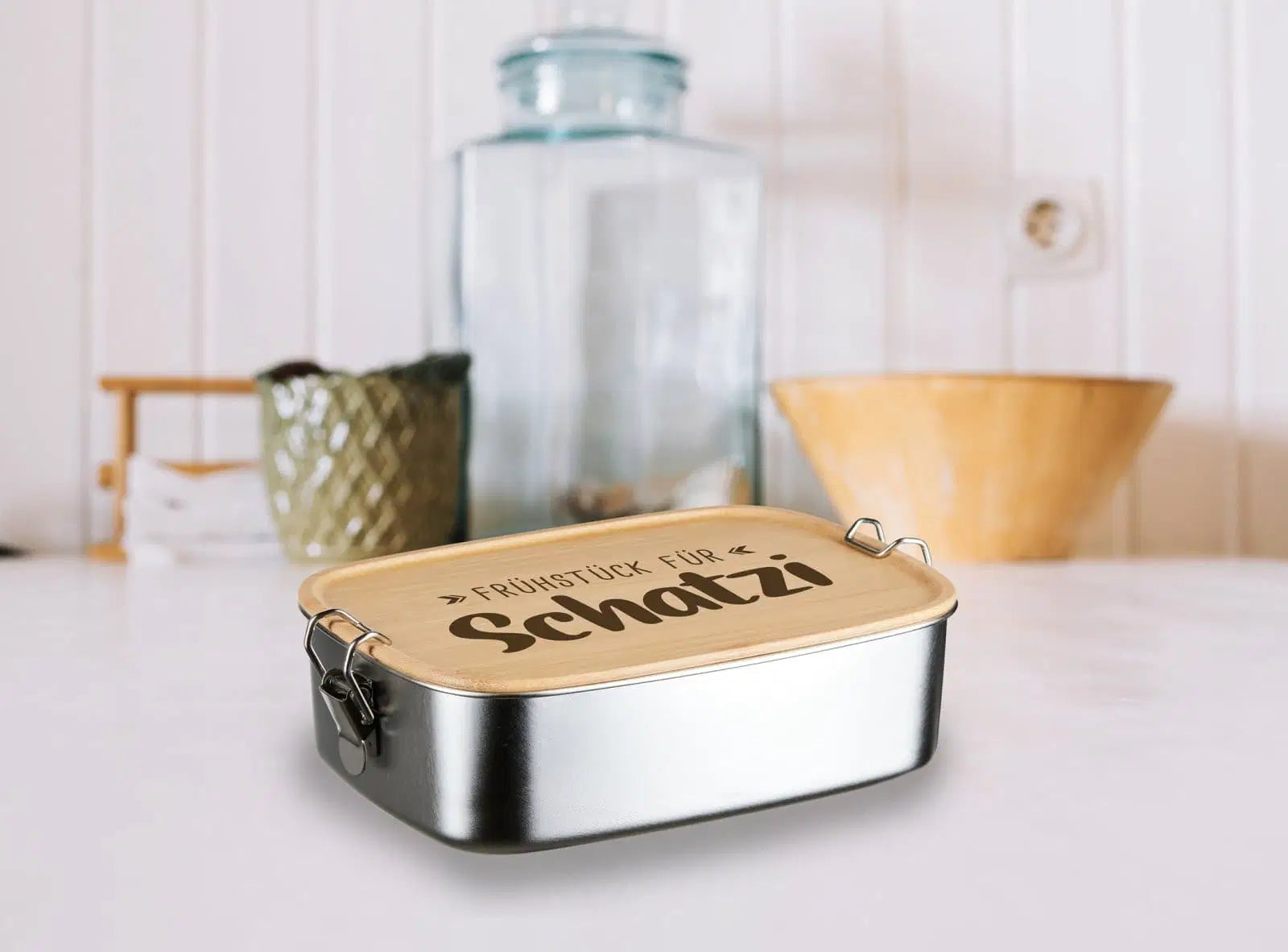 Brotdose aus Edelstahl mit Bambusdeckel & Verschluss