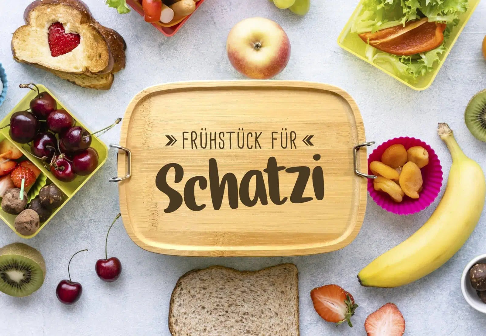 Grafik ist per Lasergravur graviert mit dem Spruch: >> Frühstück für Schatzi <<