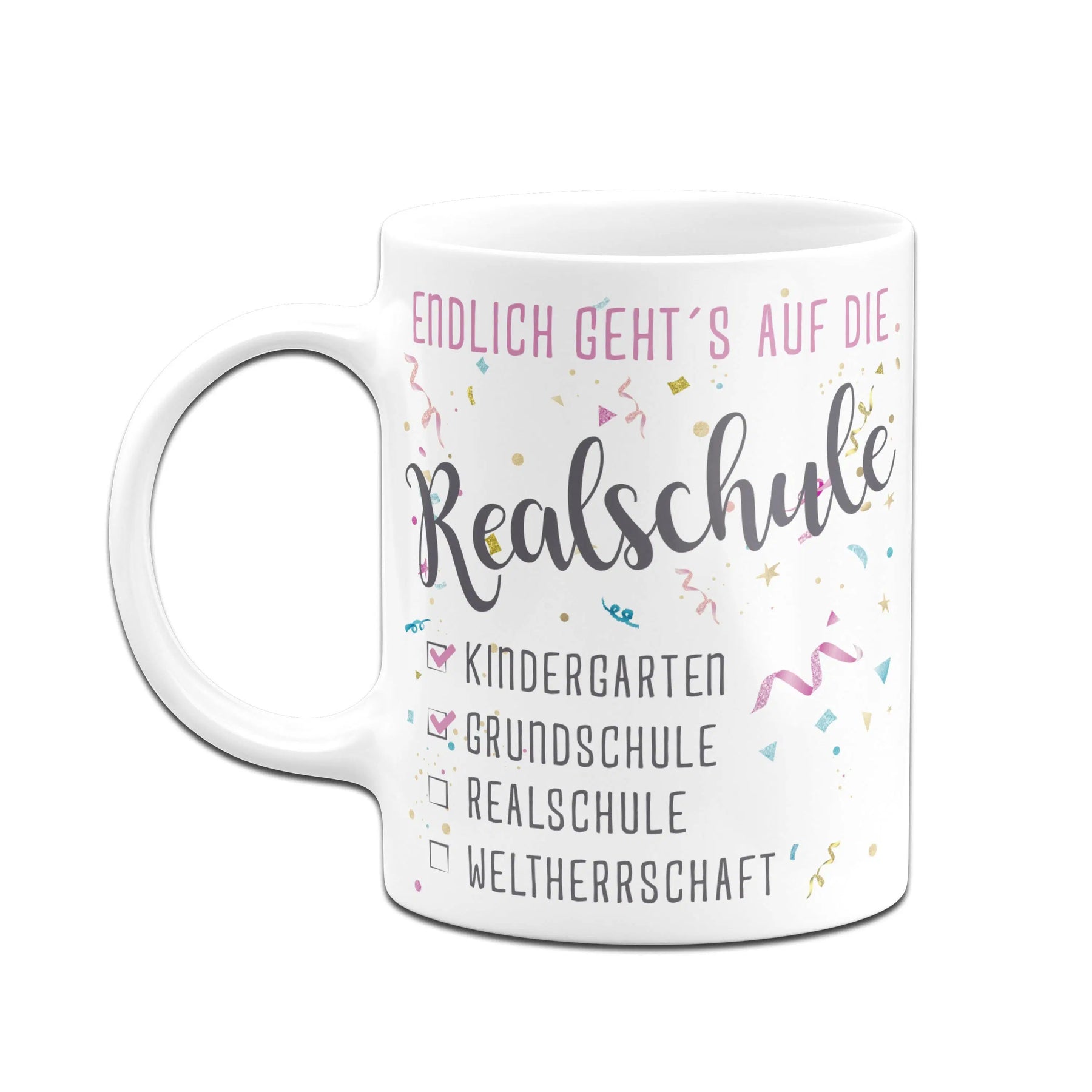 Tasse mit Spruch: Endlich geht´s auf die Realschule 🎒