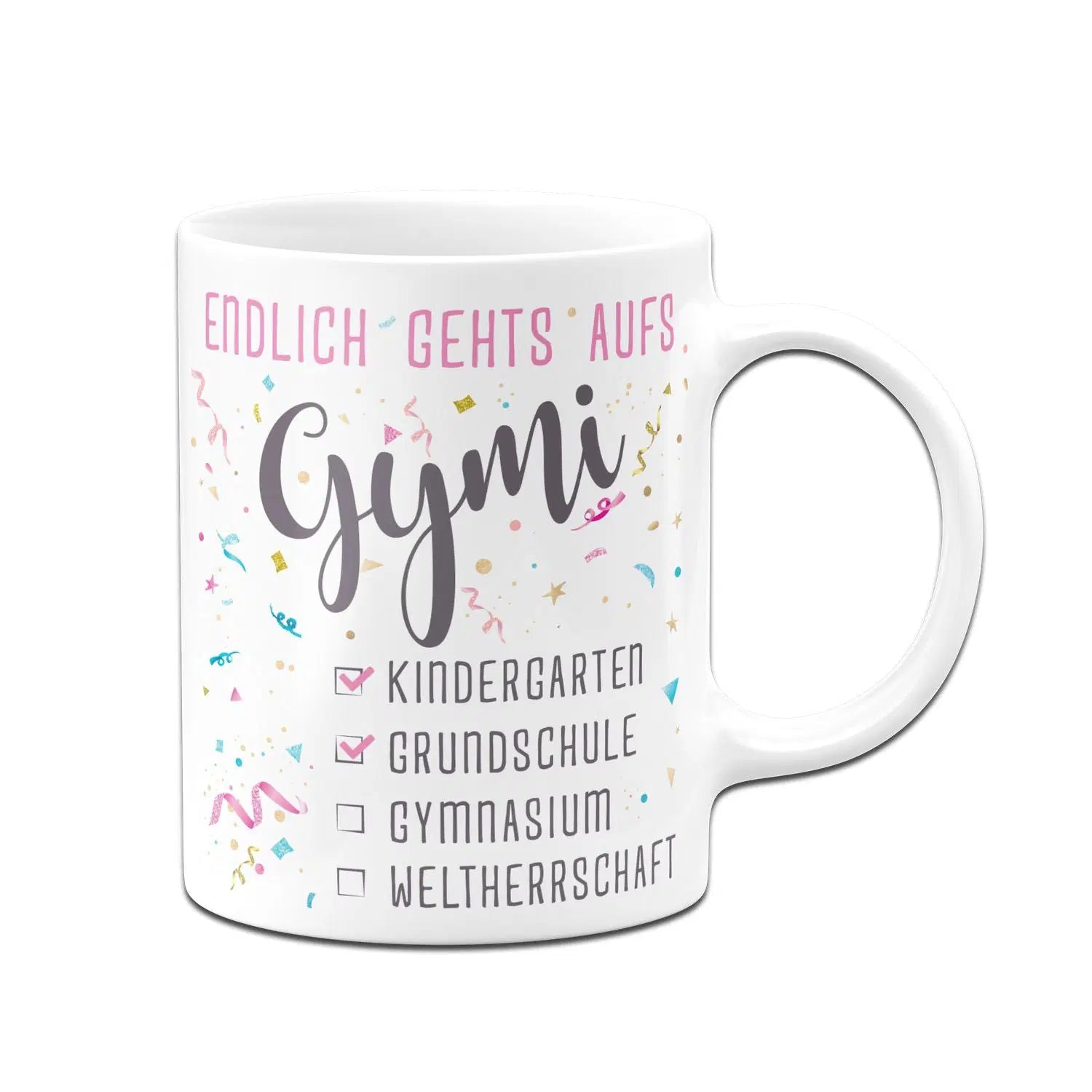 Tasse mit Spruch: Endlich gehts aufs Gymi 🎒🏫