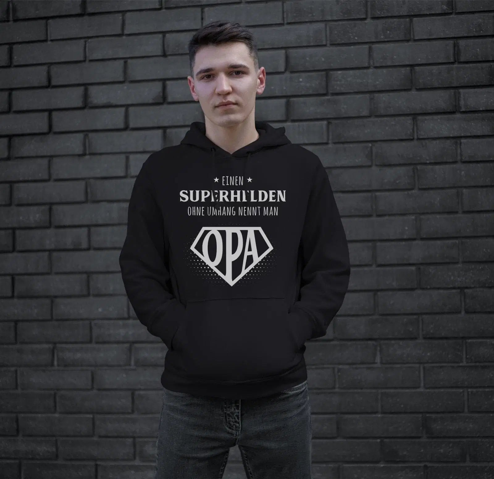 Hochwertiger Hoodie / Pullover mit Kapuze und Spruch: Einen Superhelden ohne Umhang nennt man Opa ⭐