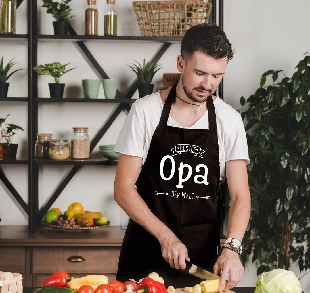 Du möchtest deinem lieben Opa ein ganz besonderes Geschenk machen? Diese Kochschürze mit dem herzlichen Aufdruck "Bester Opa der Welt" ist genau das Richtige! Egal ob zum Vatertag, zu Weihnachten, als Wichtelgeschenk oder zum Geburtstag deines Großvaters – diese Schürze verleiht jedem Anlass einen Hauch von Wärme und Liebe. Sie ist das perfekte Geschenk von Enkelkindern, um deinem Opa zu zeigen, wie sehr du ihn schätzt. Mache ihm eine Freude und überrasche ihn mit dieser hochwertigen Kochschürze, die nicht nur praktisch ist, sondern auch eine herzliche Botschaft trägt. Die frohen Weihnachtsgrüße und die besten Wünsche für deinen Opa sind bereits inklusive – alles, was du tun musst, ist, diese wundervolle Geschenkidee zu überreichen. Diese Kochschürze wird sicherlich zu einem unvergesslichen Geburtstagsgeschenk, das deinem Opa ein Lächeln ins Gesicht zaubert.