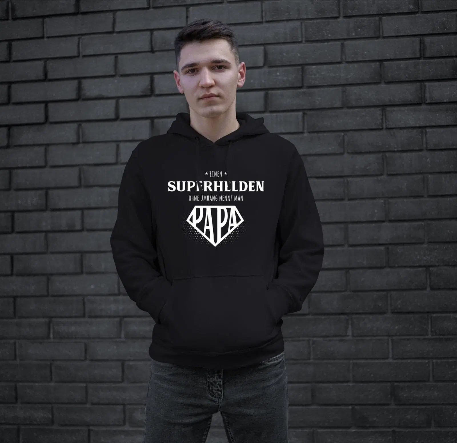 Hochwertiger Hoodie / Pullover mit Kapuze und Spruch: Einen Superhelden ohne Umhang nennt man Papa ⭐