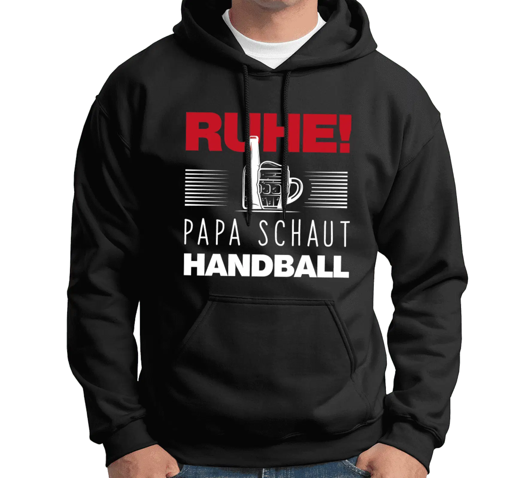 Hochwertiger Hoodie / Pullover mit Kapuze und Spruch: Ruhe! Papa schaut Handball 🍺🤾