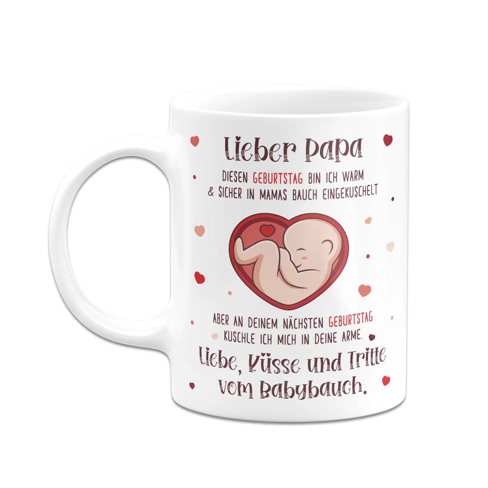Tasse mit Spruch: Lieber Papa - Diesen Geburtstag bin ich warm & sicher in Mamas Bauch eingekuschelt - Aber an deinem nächsten Geburtstag kuschle ich mich in deine Arme. Liebe, Küsse und Tritte vom Babybauch.