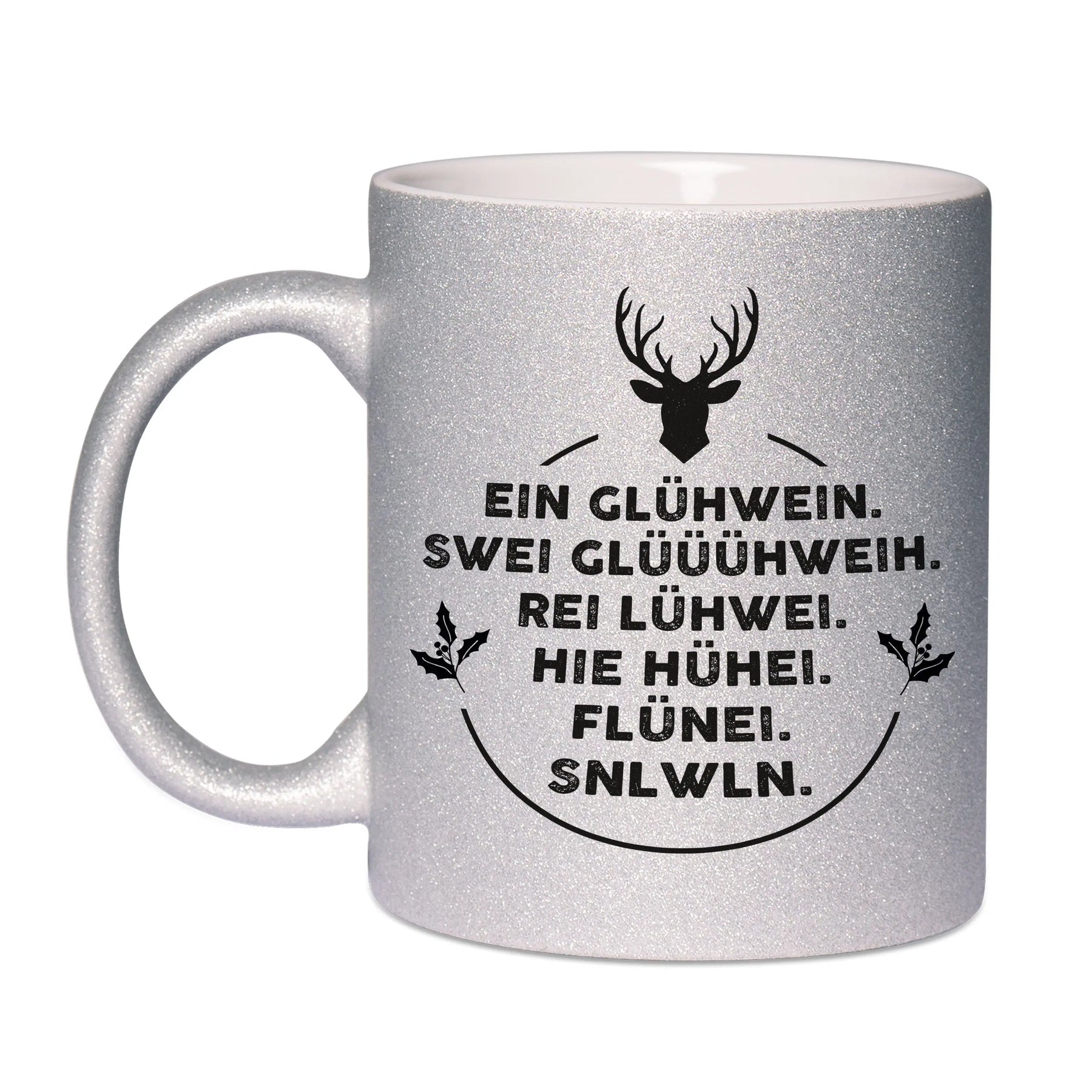 Weihnachts-Glitzertasse mit Spruch: Ein Glühwein, swei Glüüüühwein, Rei Lühwei