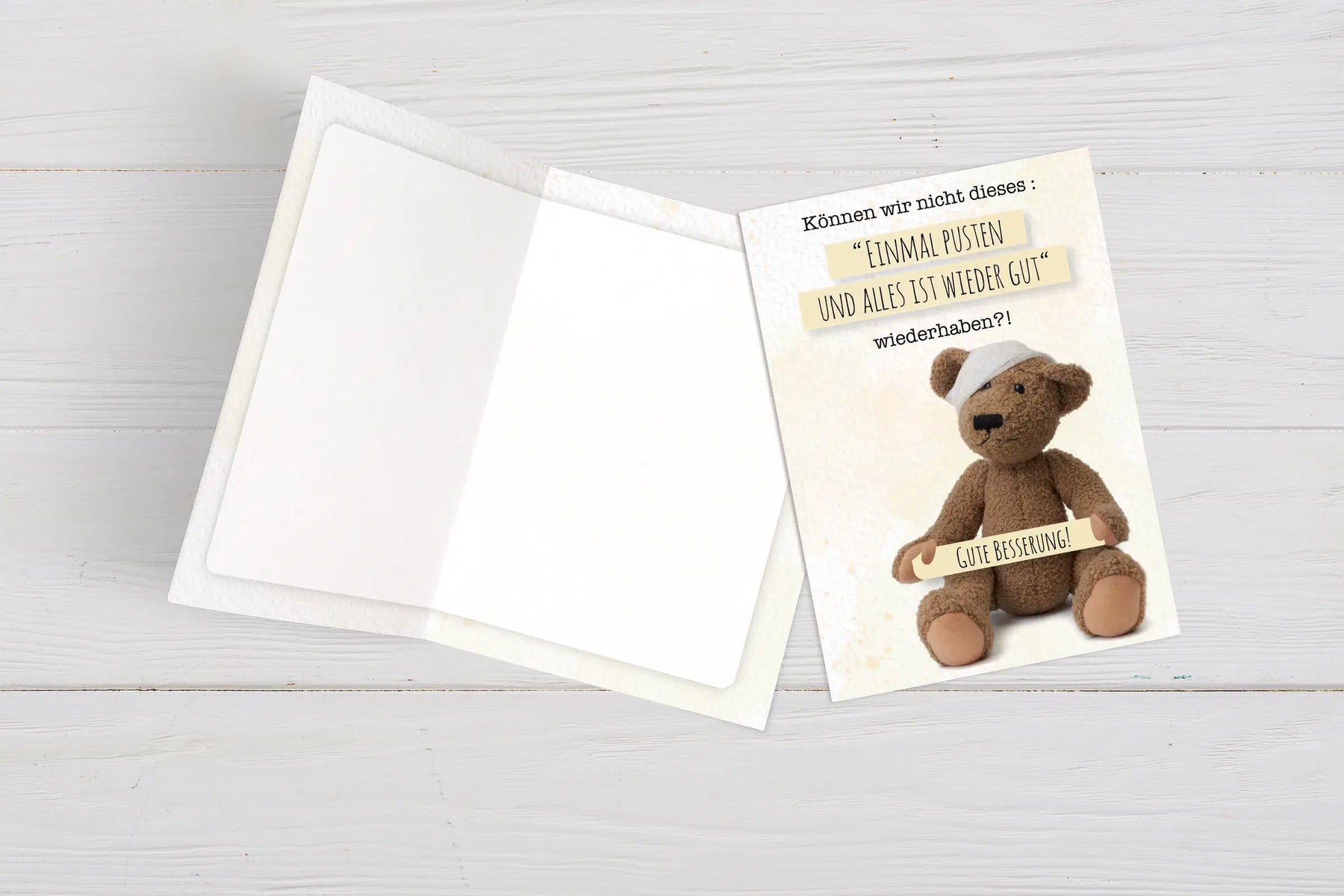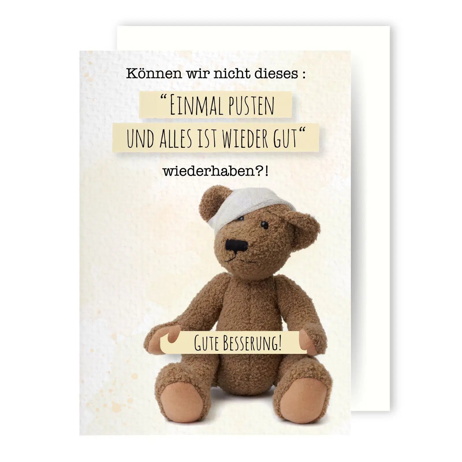 Grußkarte zur Genesung mit Spruch: Können wir nicht dieses: "Einmal pusten und alles ist wieder gut" wiederhaben?! 🧸🤕 Gute Besserung!