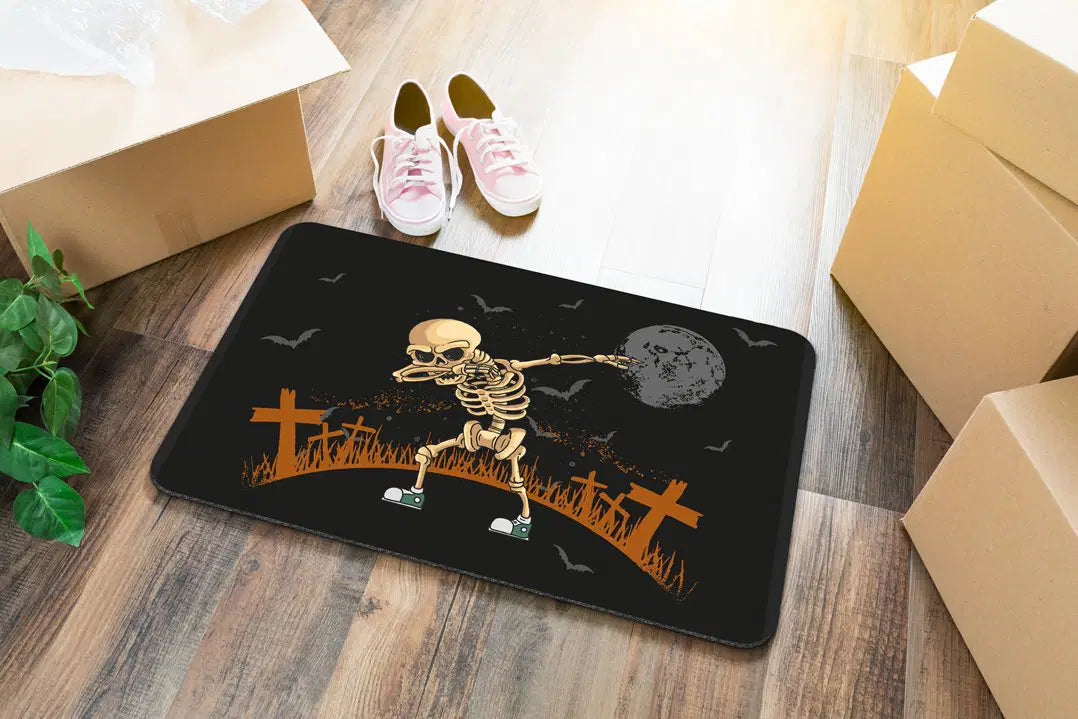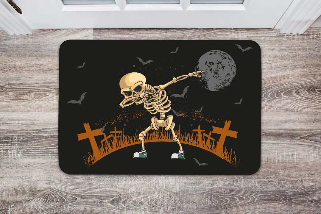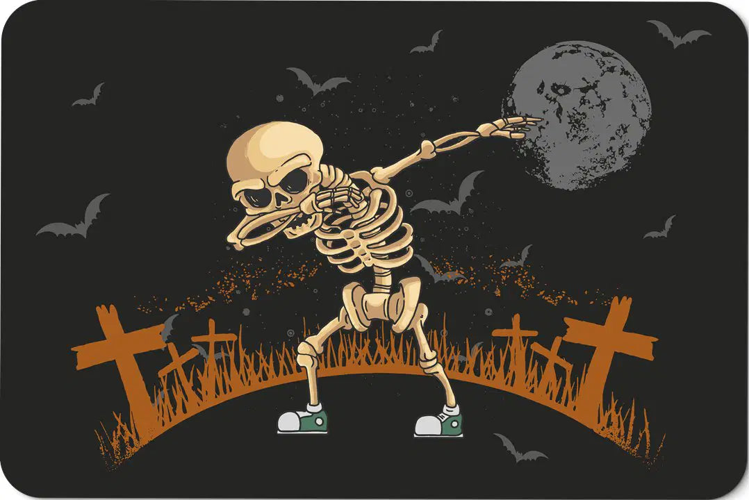 Unsere Fußmatte mit dem dabbing Skelett Motiv ist nicht nur ein echter Hingucker, sondern auch der perfekte Begleiter für die Halloween-Zeit. Das Skelett zeigt stolz seinen besten Dap und wird garantiert für Schmunzler bei deinen Gästen sorgen.