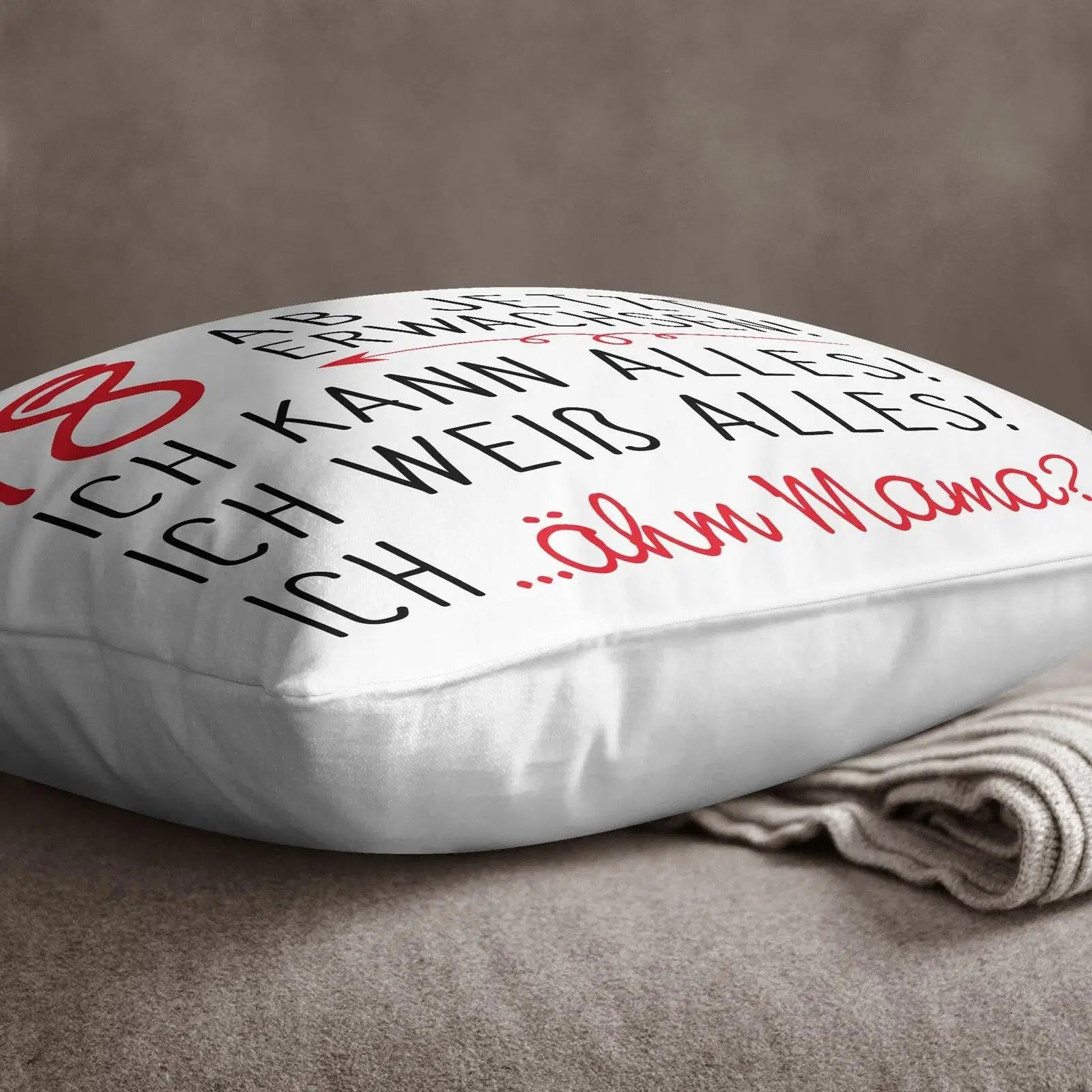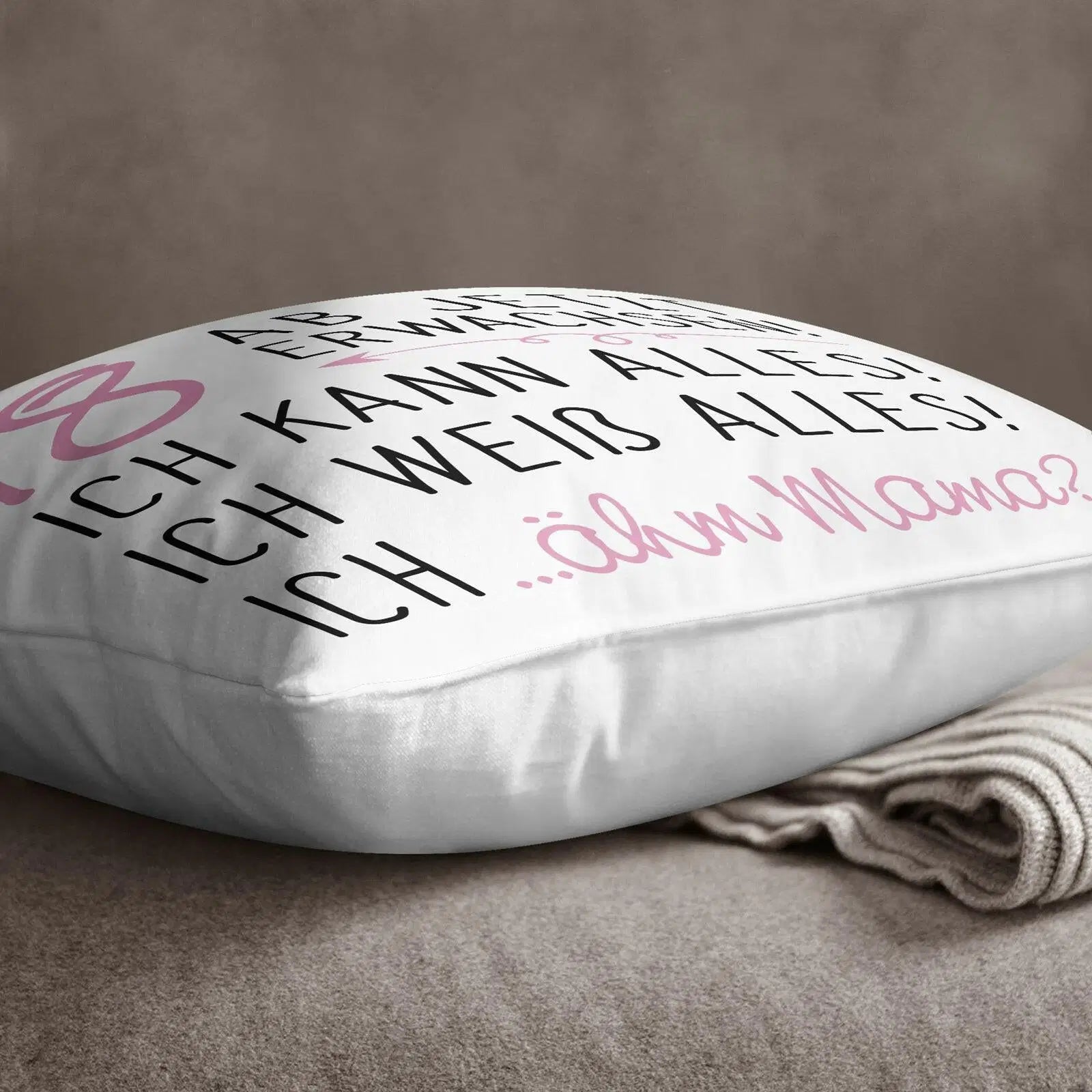 Geburtstagskissen mit Spruch: 18 ab jetzt erwachsen! Ich kann alles! Ich weiß alles! Ich ...ähm Mama?