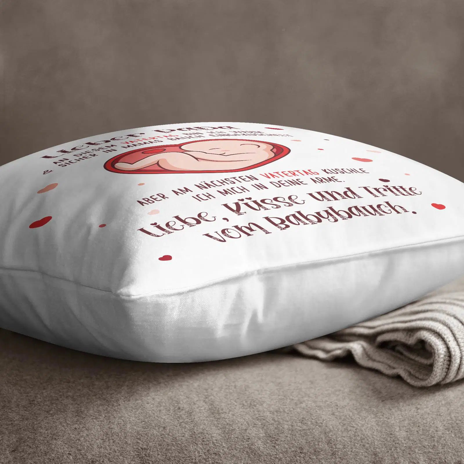 Zierkissen mit Spruch: Lieber Papa - An diesem Vatertag bin ich warm & sicher in Mamas Bauch eingekuschelt - Aber am nächsten Vatertag kuschle ich mich in deine Arme. Liebe, Küsse und Tritte vom Babybauch.