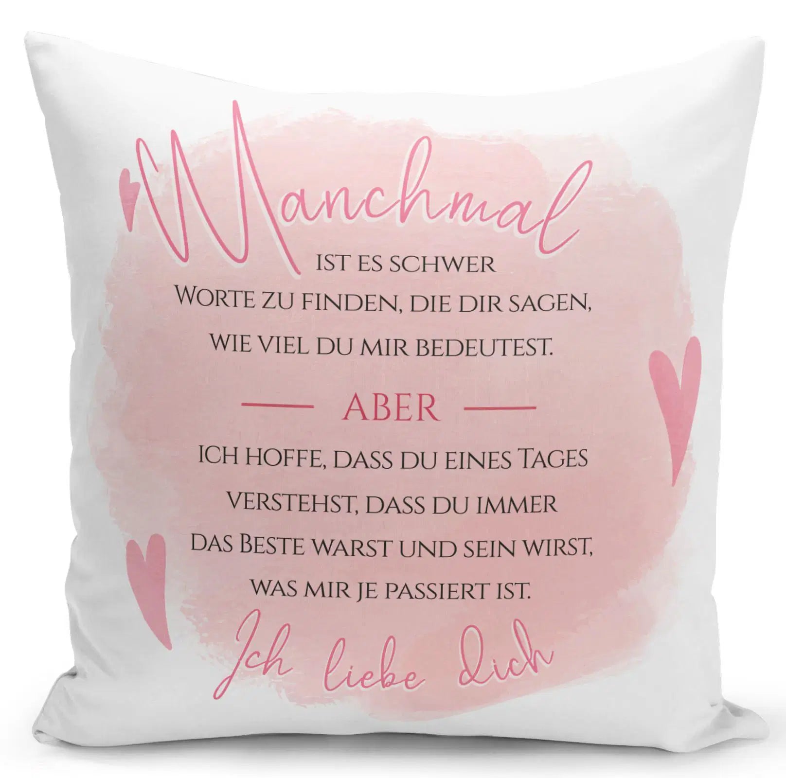 Zierkissen mit Spruch: Manchmal ist es schwer Worte zu finden, die dir sagen, wie viel du mir bedeutest. Aber ich hoffe, dass du eines Tages verstehst, dass du immer das Beste warst und sein wirst, was mir je passiert ist. Ich liebe dich 💗