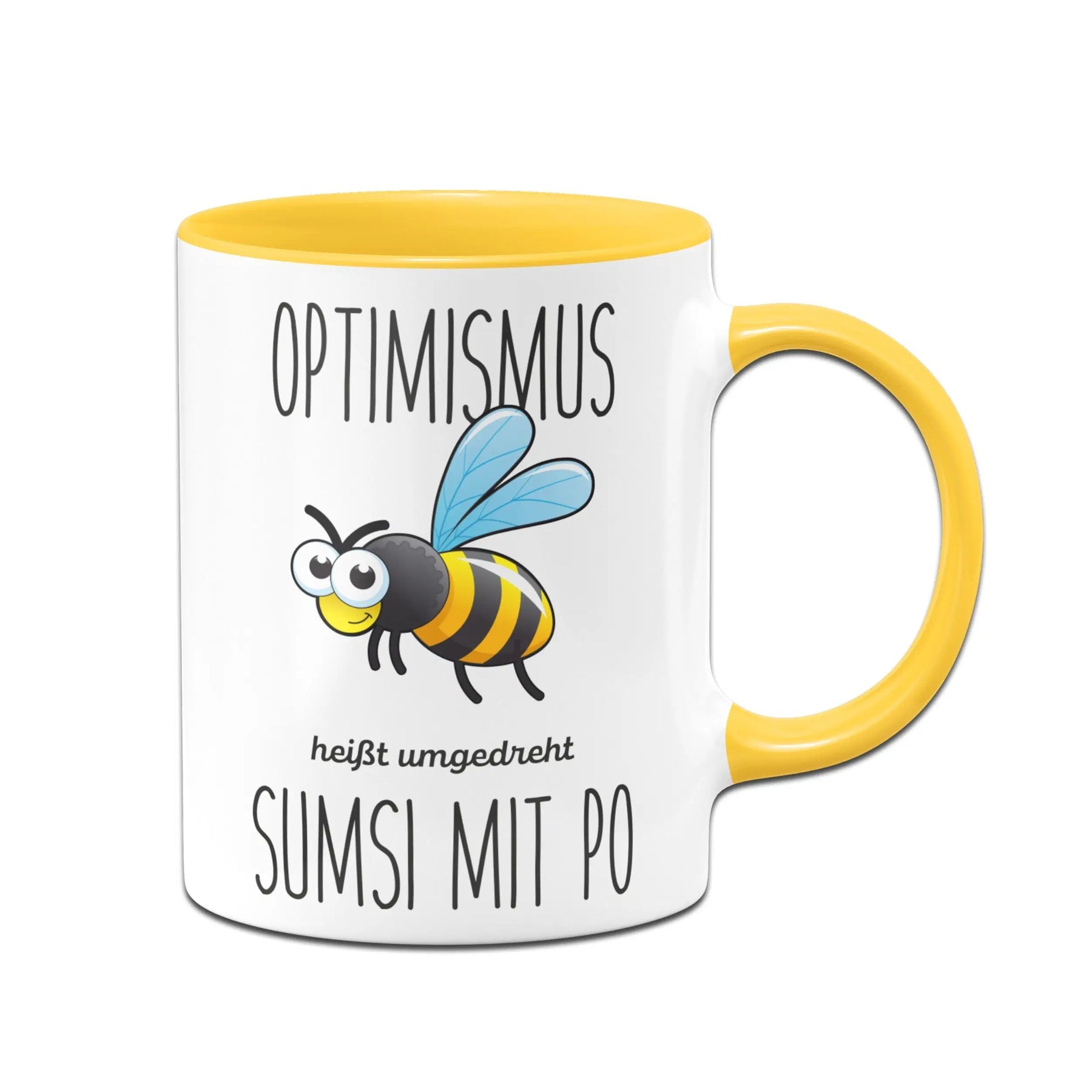 Tasse mit Spruch: OPTIMISMUS heißt umgedreht SUMSI MIT PO 🐝