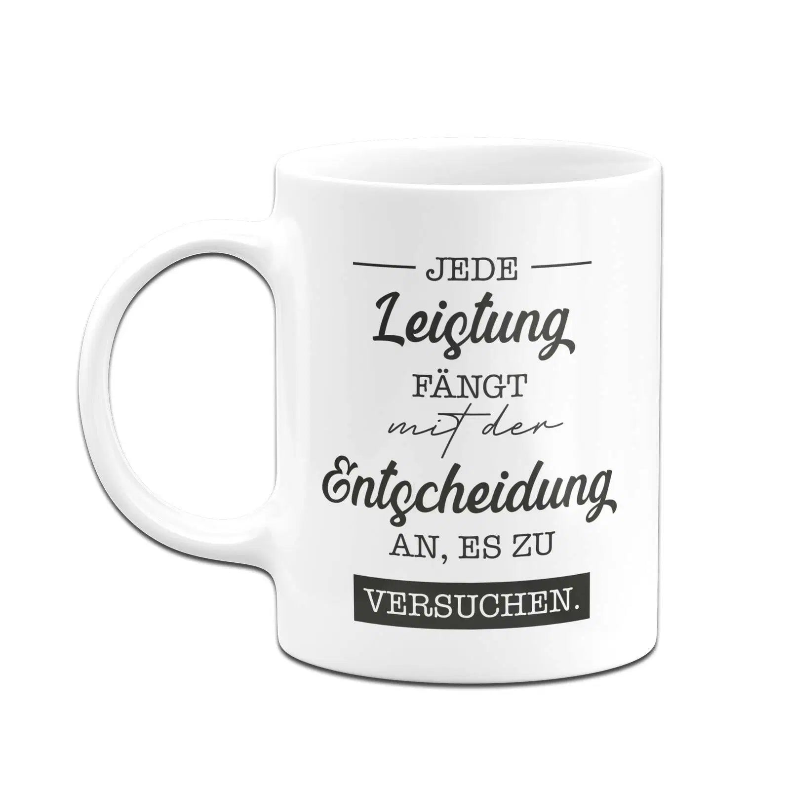 Motivationstasse mit Spruch: Jede Leistung fängt mit der Entscheidung an, es zu versuchen.