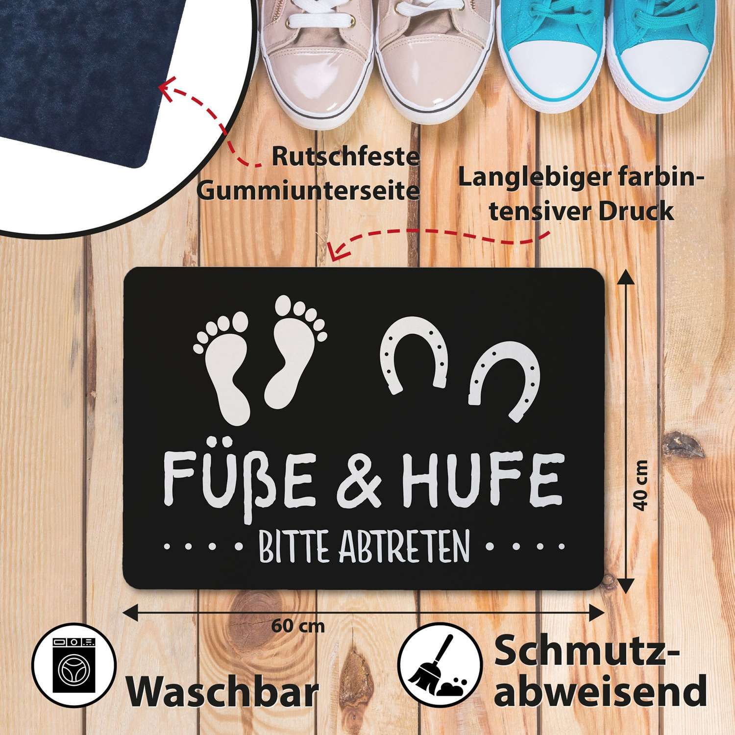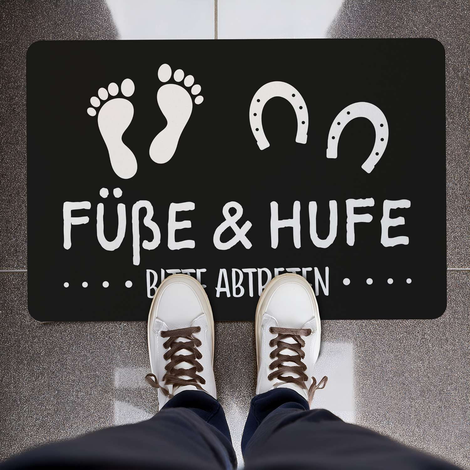 Unsere Fußmatte „Füße & Hufe bitte abtreten“ wird in unserer eigenen Druckerei in Deutschland mit hochwertigem Sublimationsdruck veredelt. Das Motiv ist extrem robust und farbintensiv, gemacht für häufige Nutzung im Alltag. Die saugstarke Filzoberfläche reinigt zuverlässig Schuh- und Hufsohlen, während die rutschfeste Gummi-Rückseite für Stabilität sorgt. Mit Maßen von 60 x 40 cm passt sie ideal vor die meisten Türen. Die Matte ist waschbar und schmutzabweisend, was die Pflege besonders einfach macht.