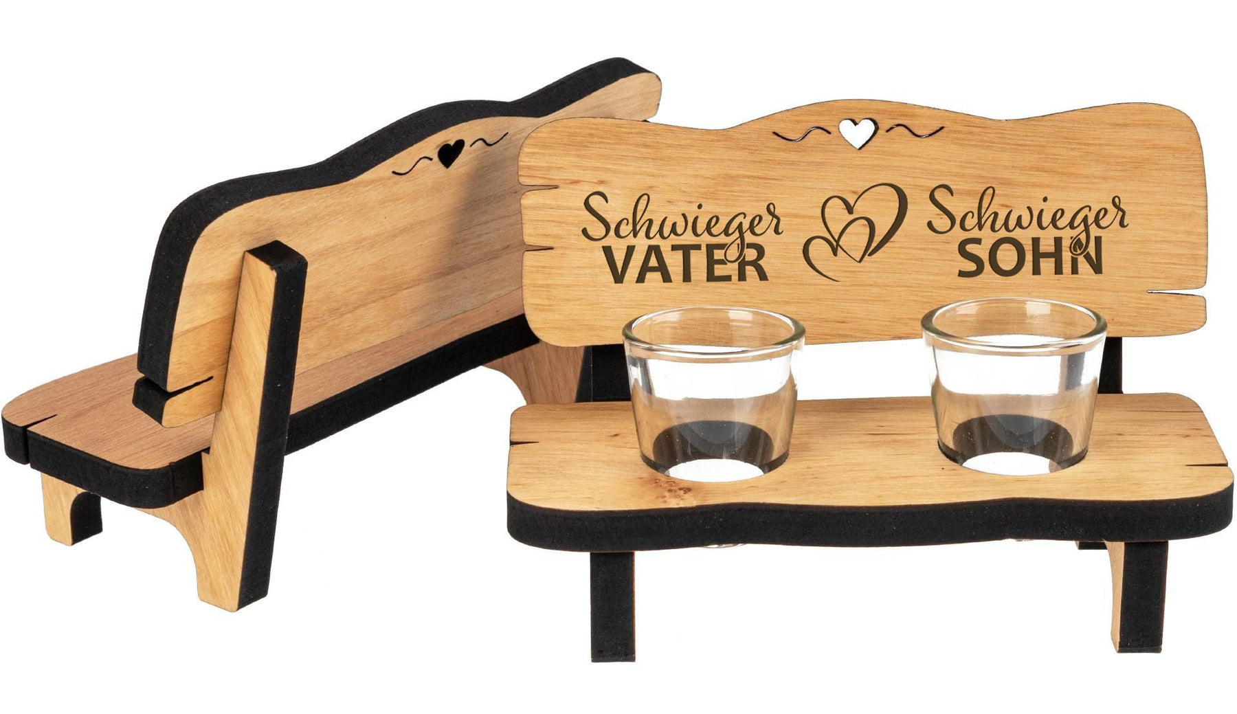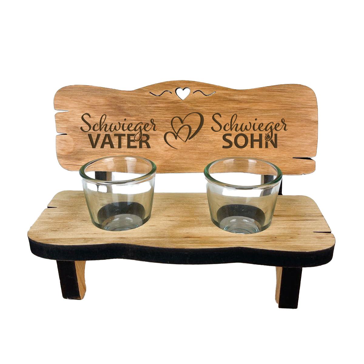 - Lieferumfang: Eine Schnapsbank aus Echtholz mit Gravur und zwei passenden Schnapsgläsern.