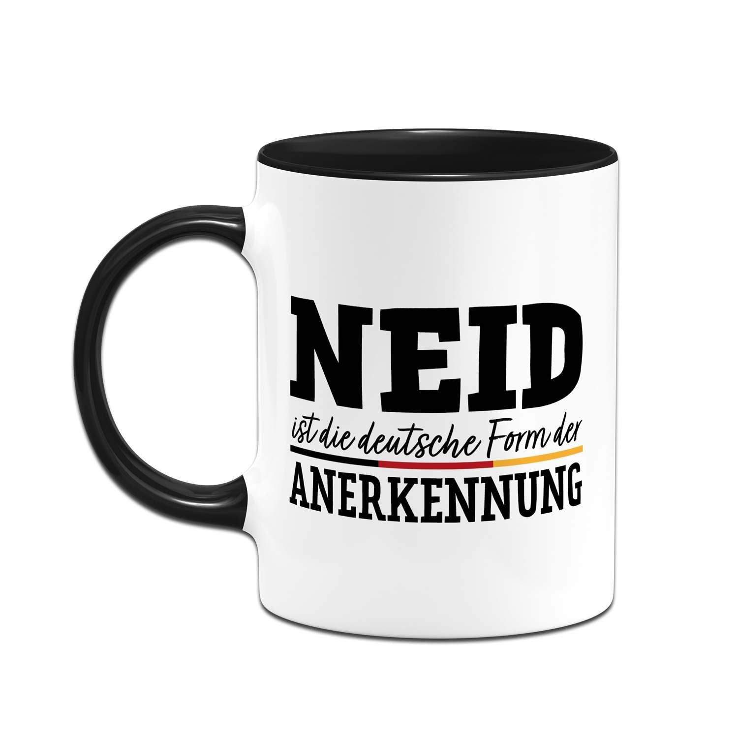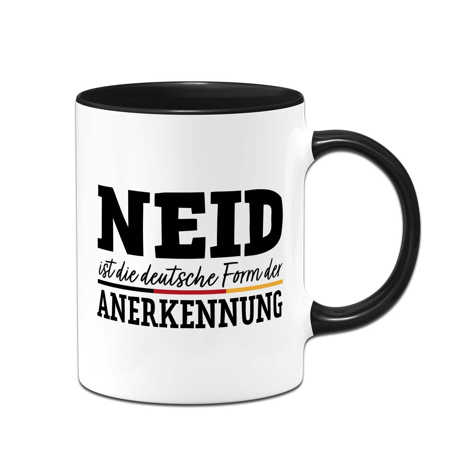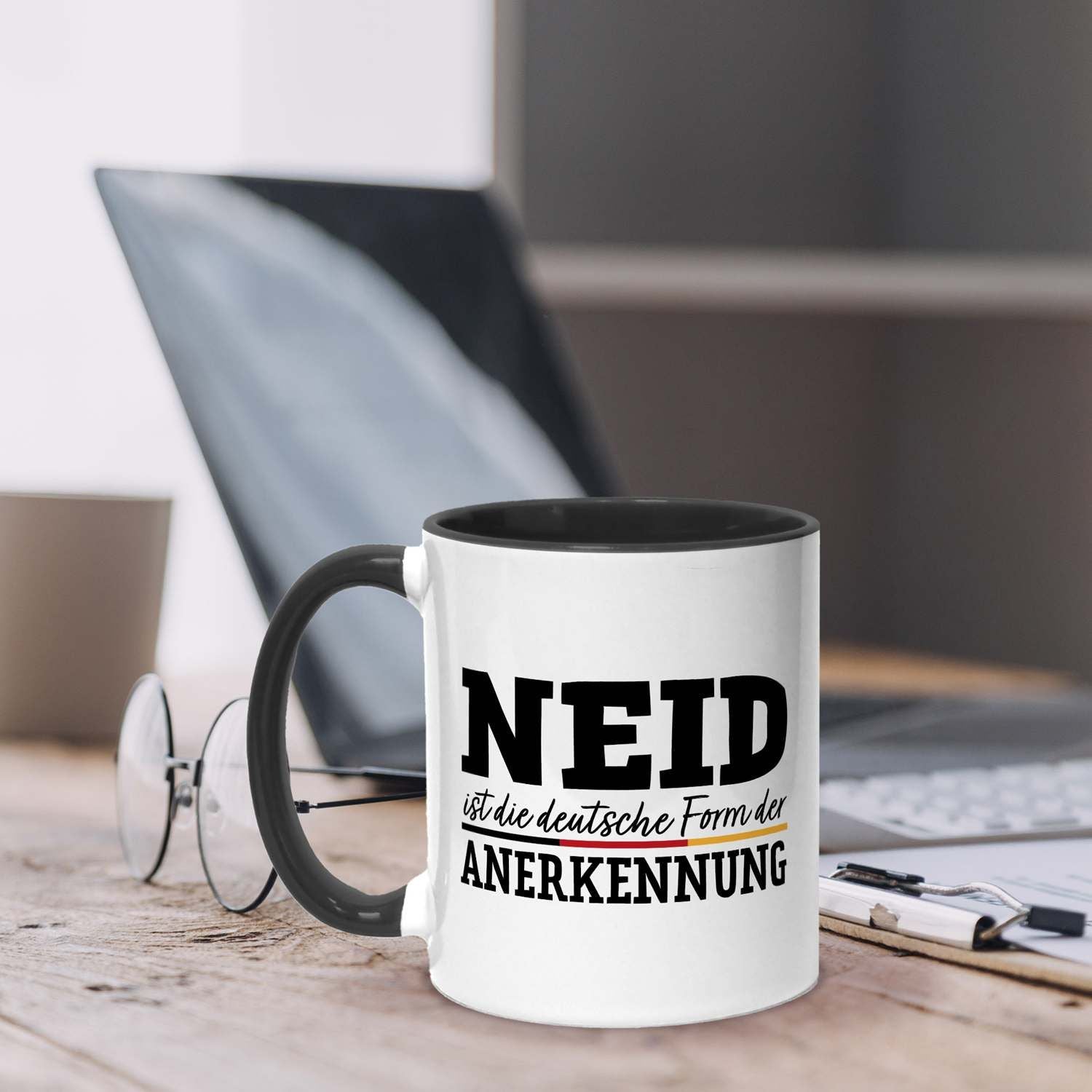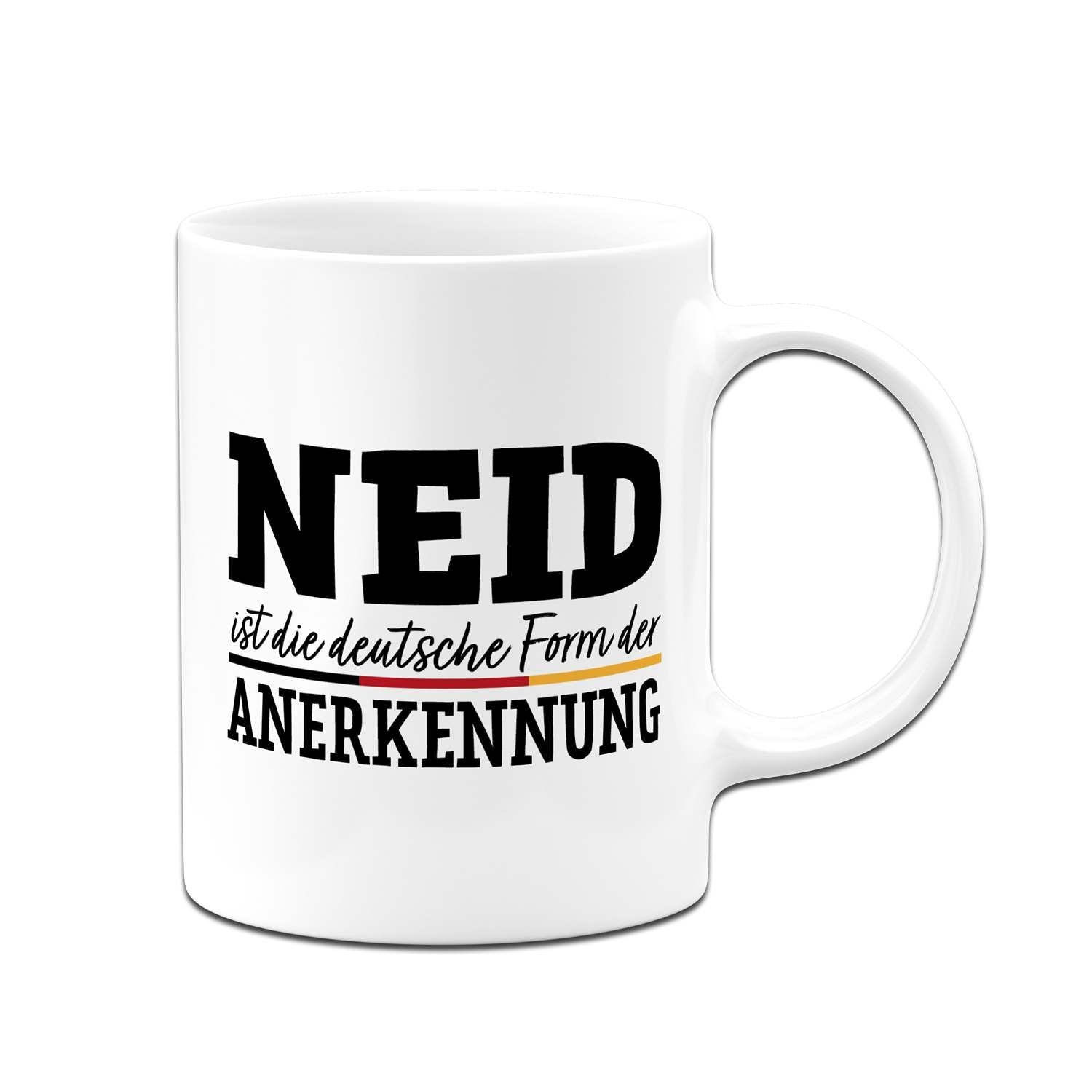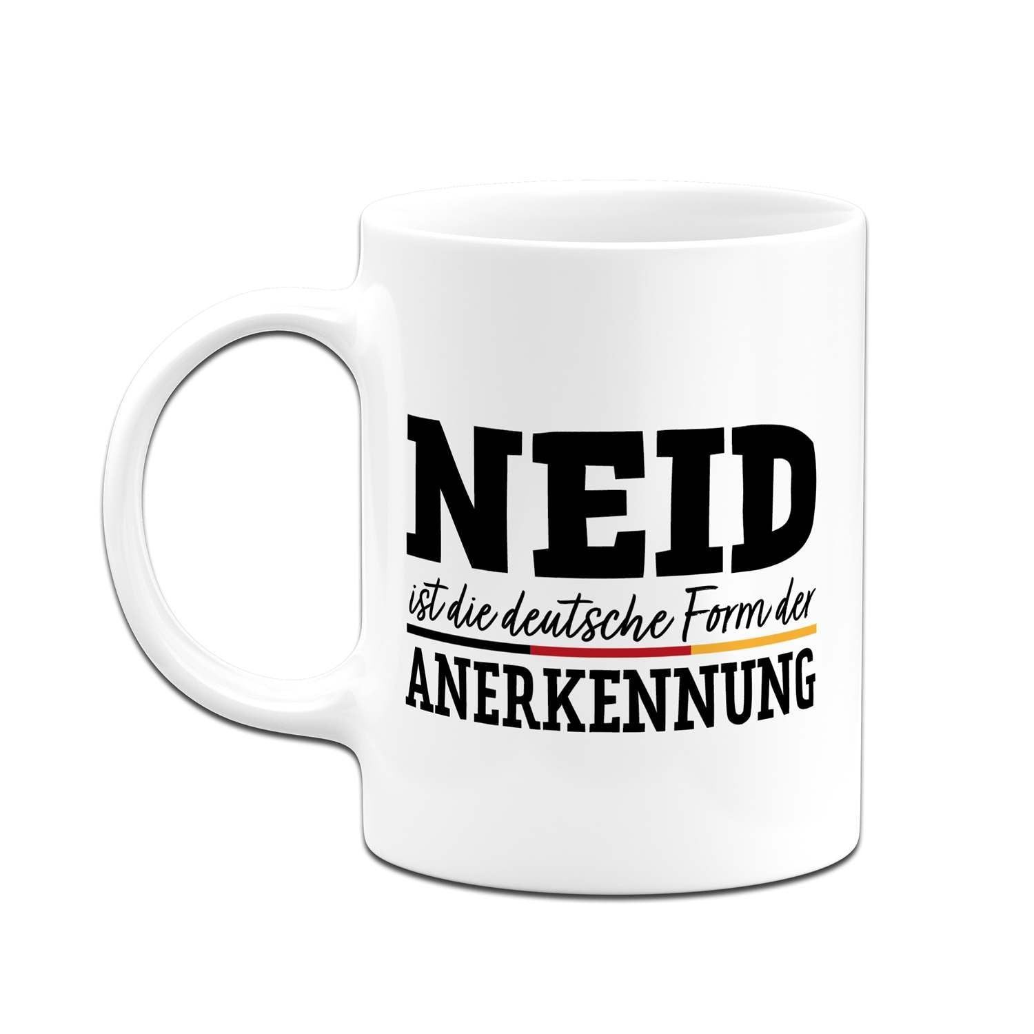 Du suchst eine Tasse mit Spruch, die gleichzeitig humorvoll und doch treffend ist? Diese Kaffeetasse mit dem witzigen Zitat 'Neid ist die deutsche Form der Anerkennung' ist das perfekte Statement für Büro und Zuhause. Ein origineller Blickfang, der garantiert für Schmunzeln sorgt und zeigt, dass du Humor hast.