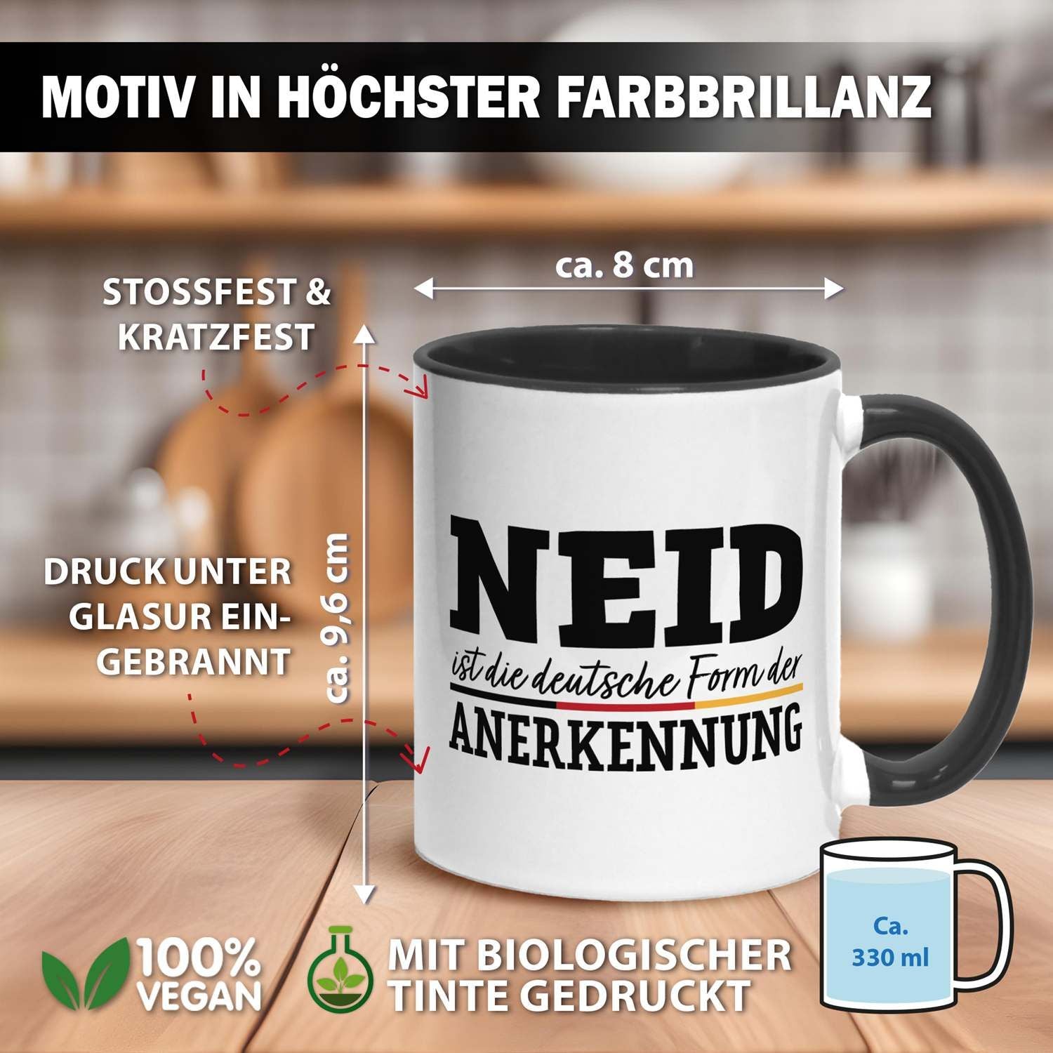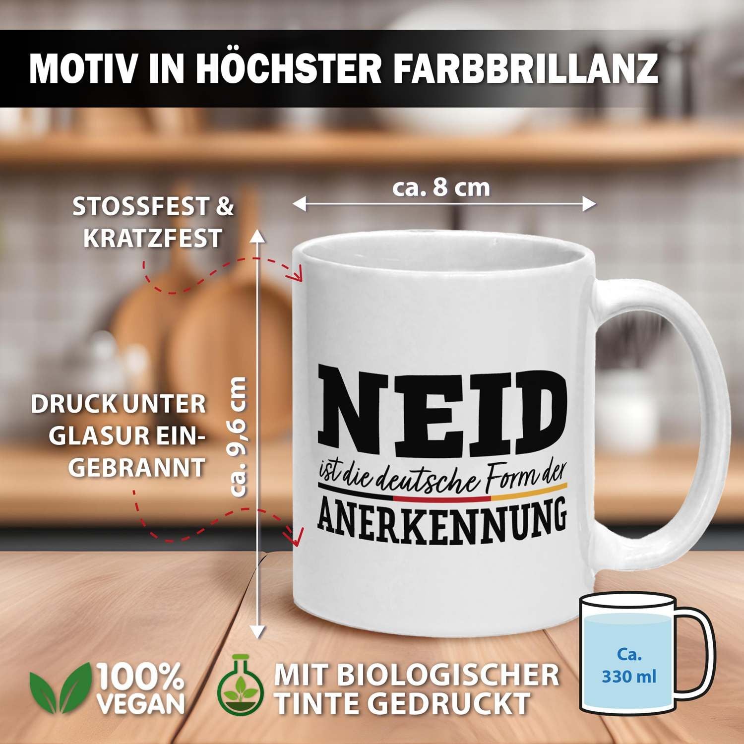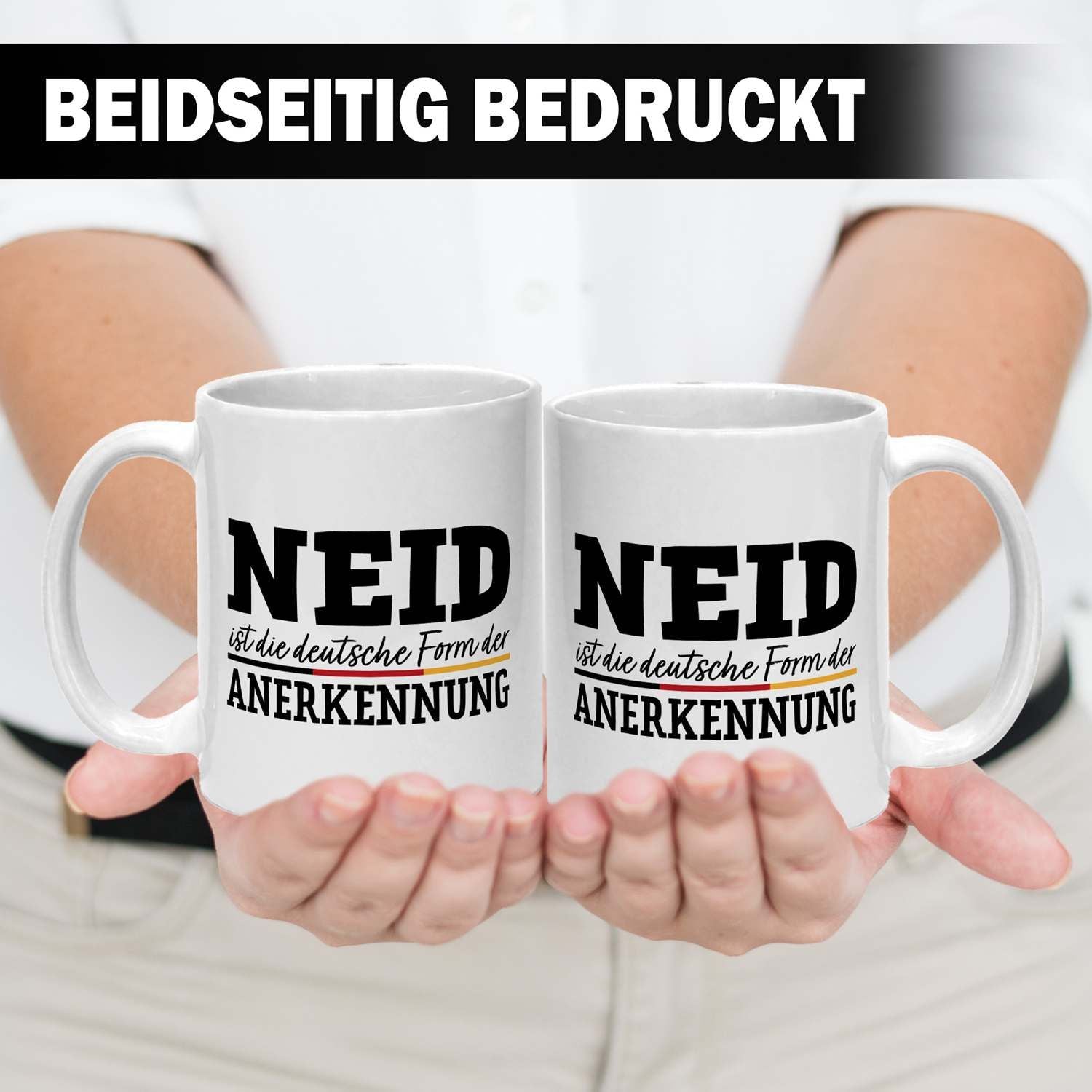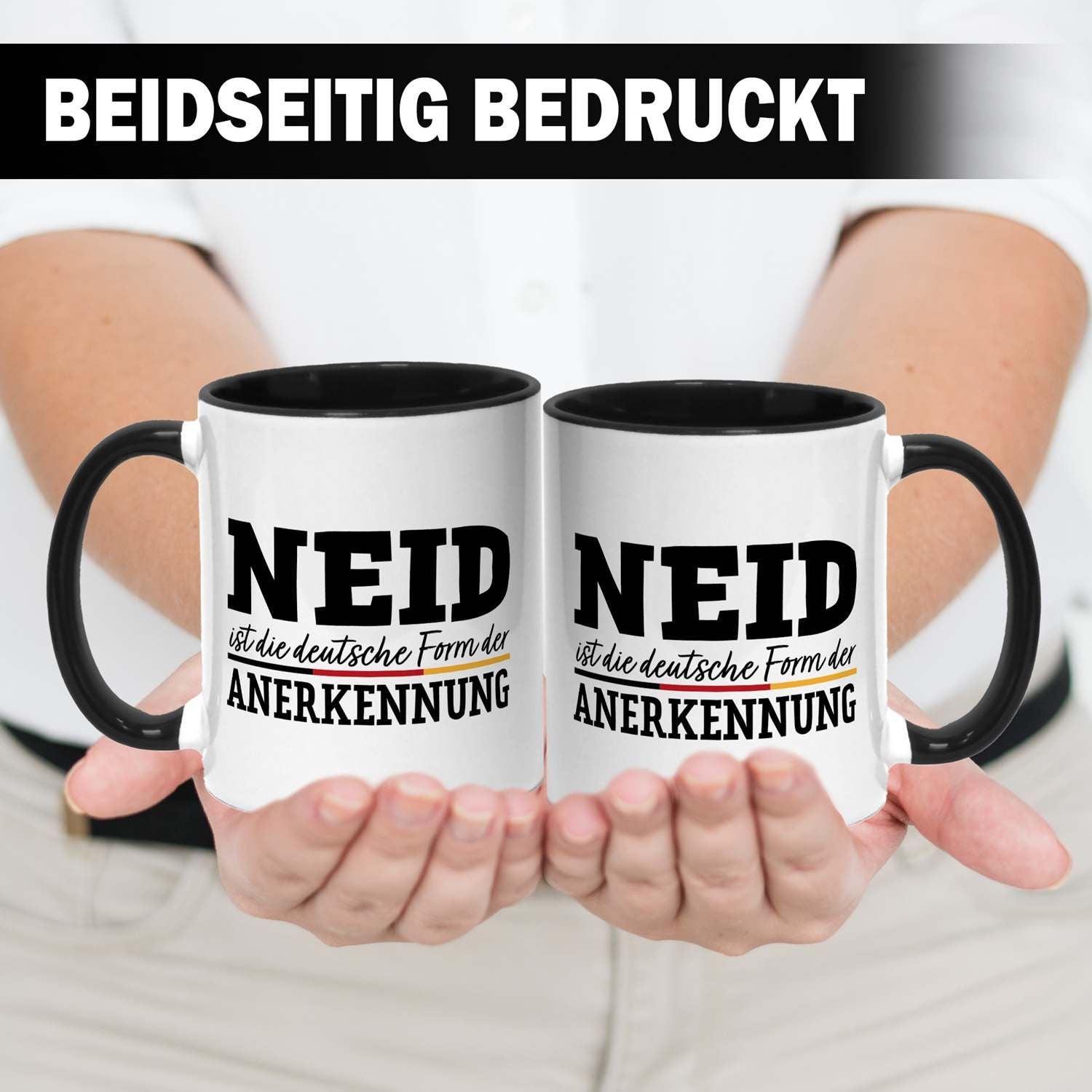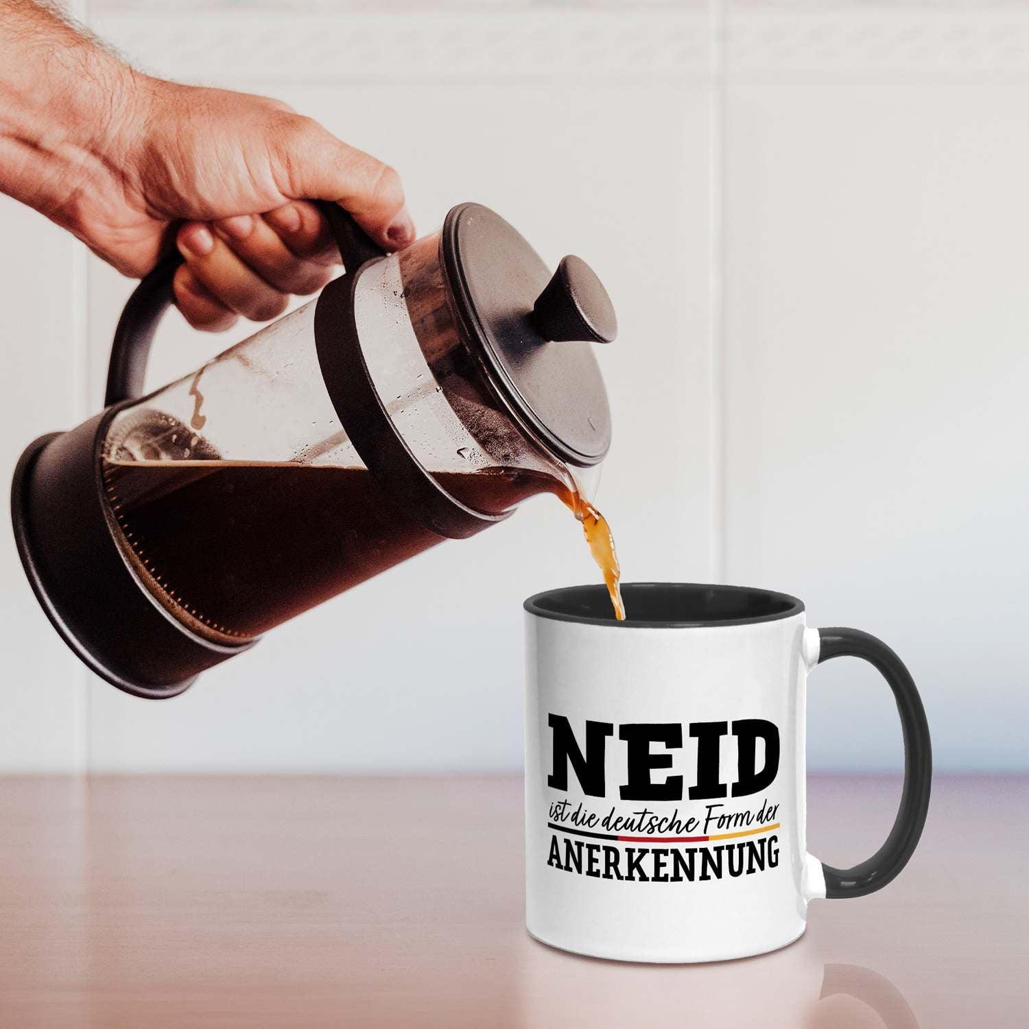 Du suchst eine Tasse mit Spruch, die gleichzeitig humorvoll und doch treffend ist? Diese Kaffeetasse mit dem witzigen Zitat 'Neid ist die deutsche Form der Anerkennung' ist das perfekte Statement für Büro und Zuhause. Ein origineller Blickfang, der garantiert für Schmunzeln sorgt und zeigt, dass du Humor hast.