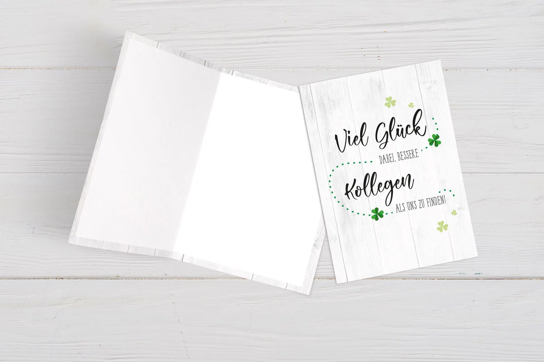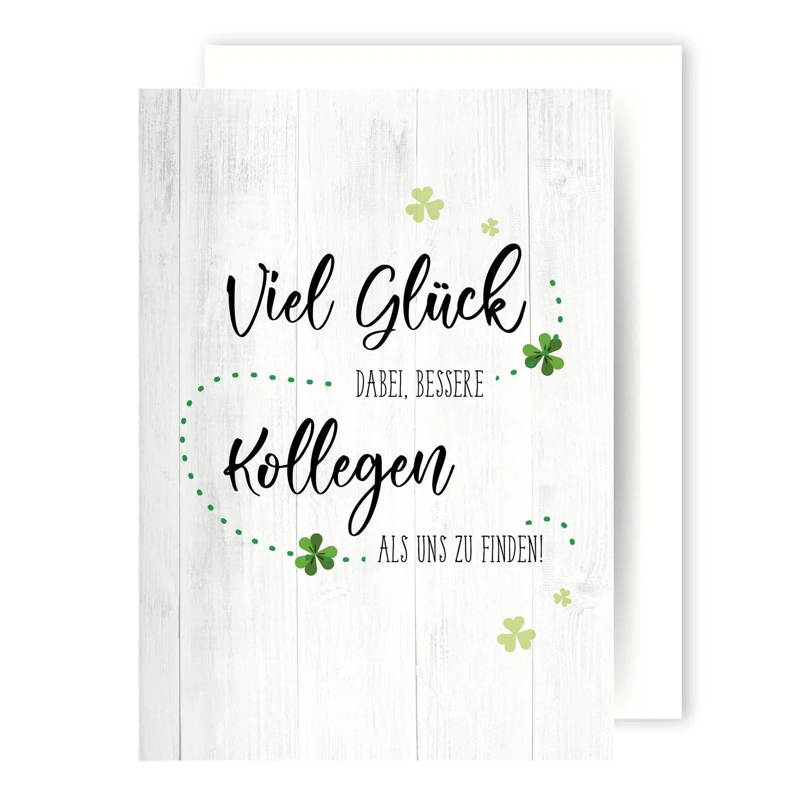Grußkarte zum Abschied mit Spruch: Viel Glück dabei bessere Kollegen als uns zu finden! ☘️