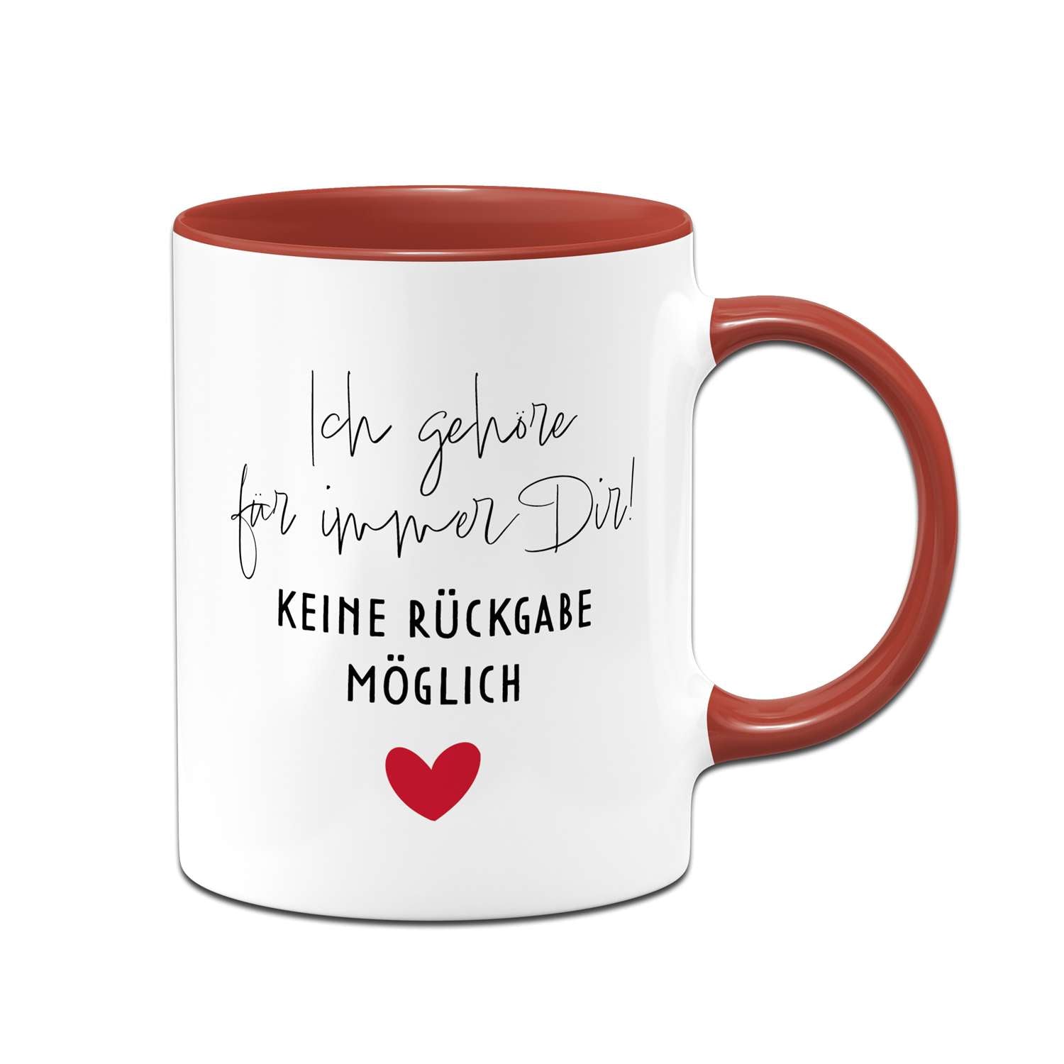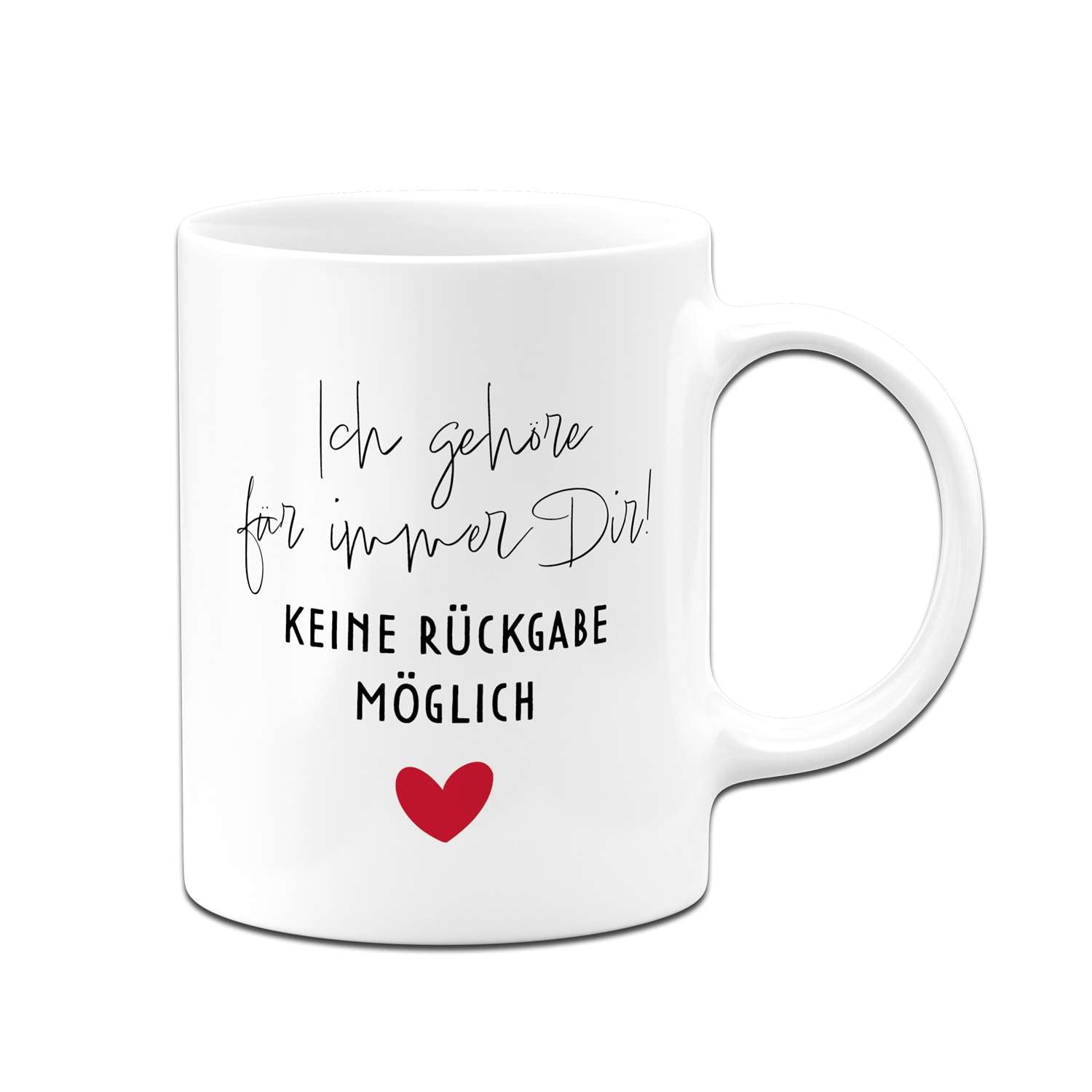Diese Tasse mit Spruch „Ich gehöre für immer Dir! Keine Rückgabe möglich“ sagt klar, was Sache ist – liebevoll, verbindlich und mit einem kleinen Augenzwinkern. Perfekt für alle, die ihrem Lieblingsmenschen jeden Morgen zeigen wollen: Du bist’s. Für immer.