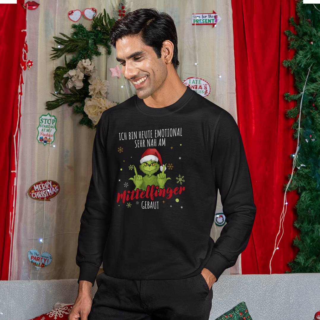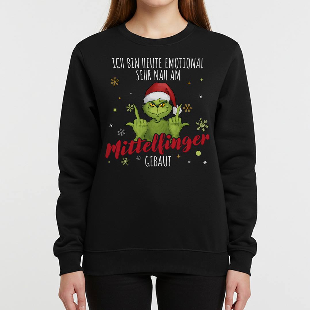Hochwertiger Pullover mit Grinch Motiv und Spruch: Ich bin heute emotional sehr nah am Mittelfinger gebaut 🖕