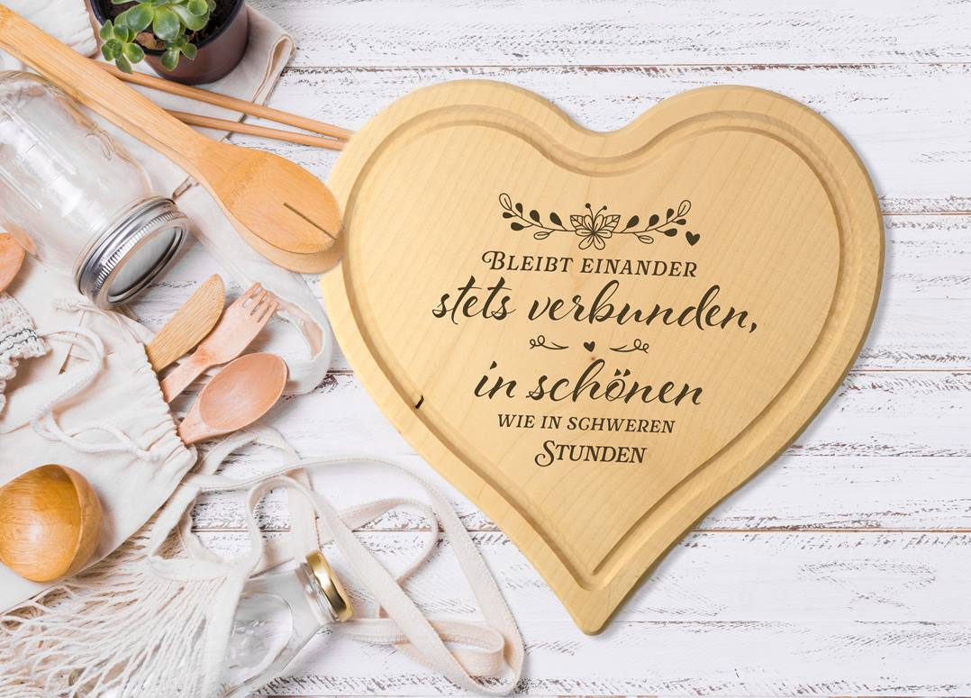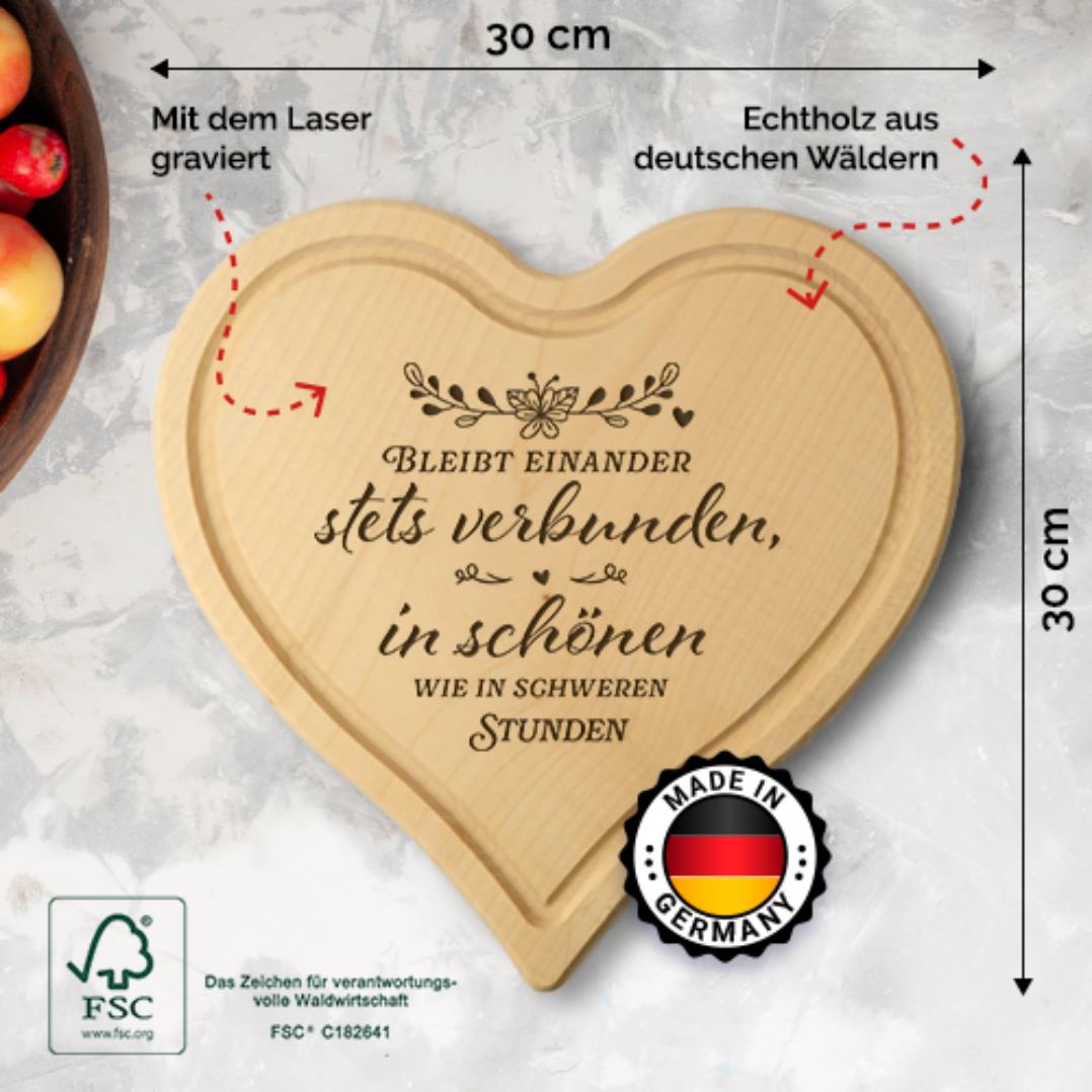 Entdecke unser einzigartiges Schneidebrett in Herzform, das nicht nur durch seine Qualität überzeugt, sondern auch eine besondere Botschaft trägt: „Bleibt einander stets verbunden, in schönen wie in schweren Stunden.“ Dieses liebevoll gestaltete und in Deutschland hergestellte Küchenaccessoire ist das perfekte Geschenk für Menschen, die dir am Herzen liegen. Ob für frisch Verheiratete, zum Jahrestag oder einfach als Zeichen der Verbundenheit für einen Freund/Freundin – dieses gravierte Schneidebrett ist ein Symbol für Liebe und Zusammenhalt.