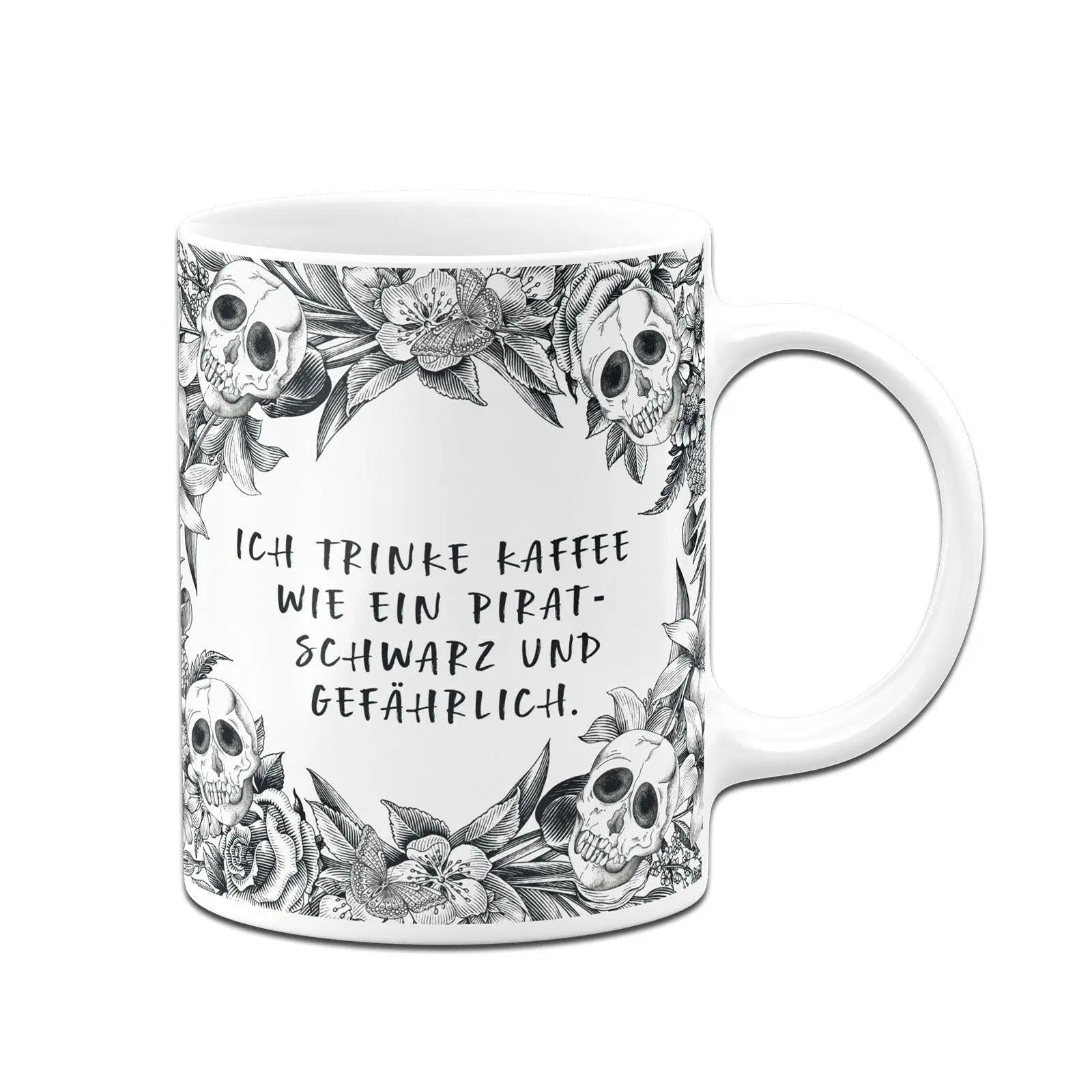 Skull Statement 💀 Totenkopf Tasse mit Spruch: Ich trinke Kaffee wie ein Pirat - schwarz und gefährlich.  (im Rundumdruck)
