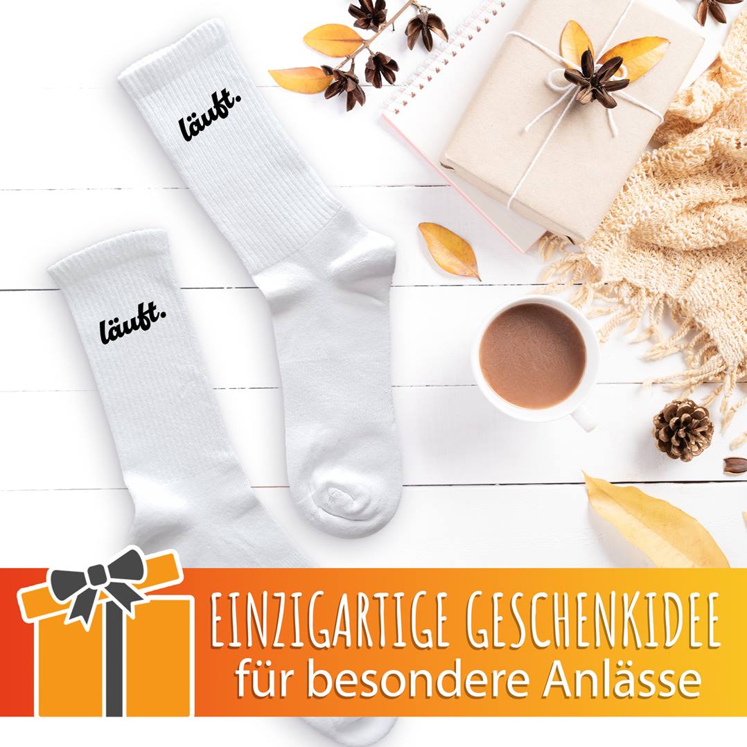 Diese Socken laufen einfach – mit dir und für dich. Der coole „läuft.“-Spruch bringt auf den Punkt, was du denkst. Lässig, humorvoll und funktional: Perfekt für Alltag, Sofa oder Sportplatz.