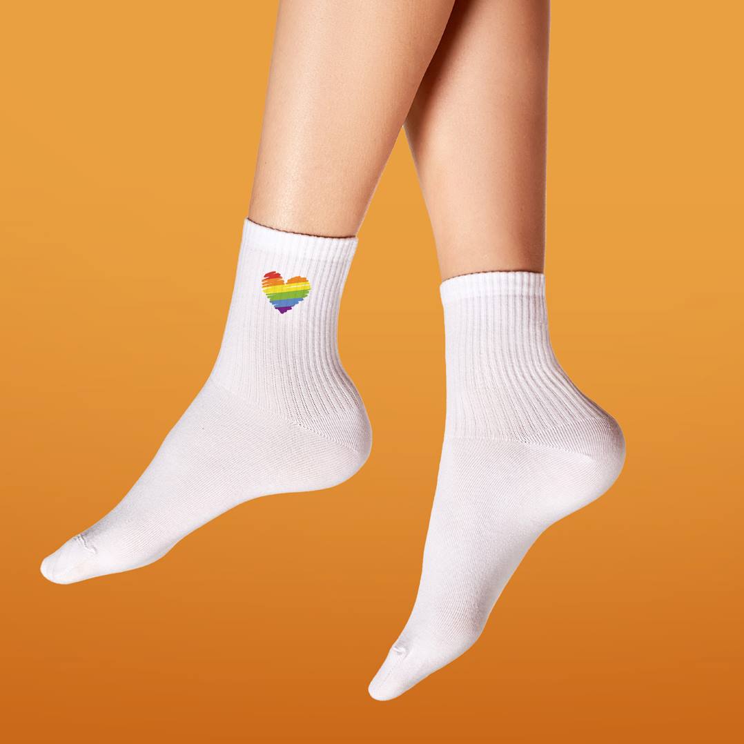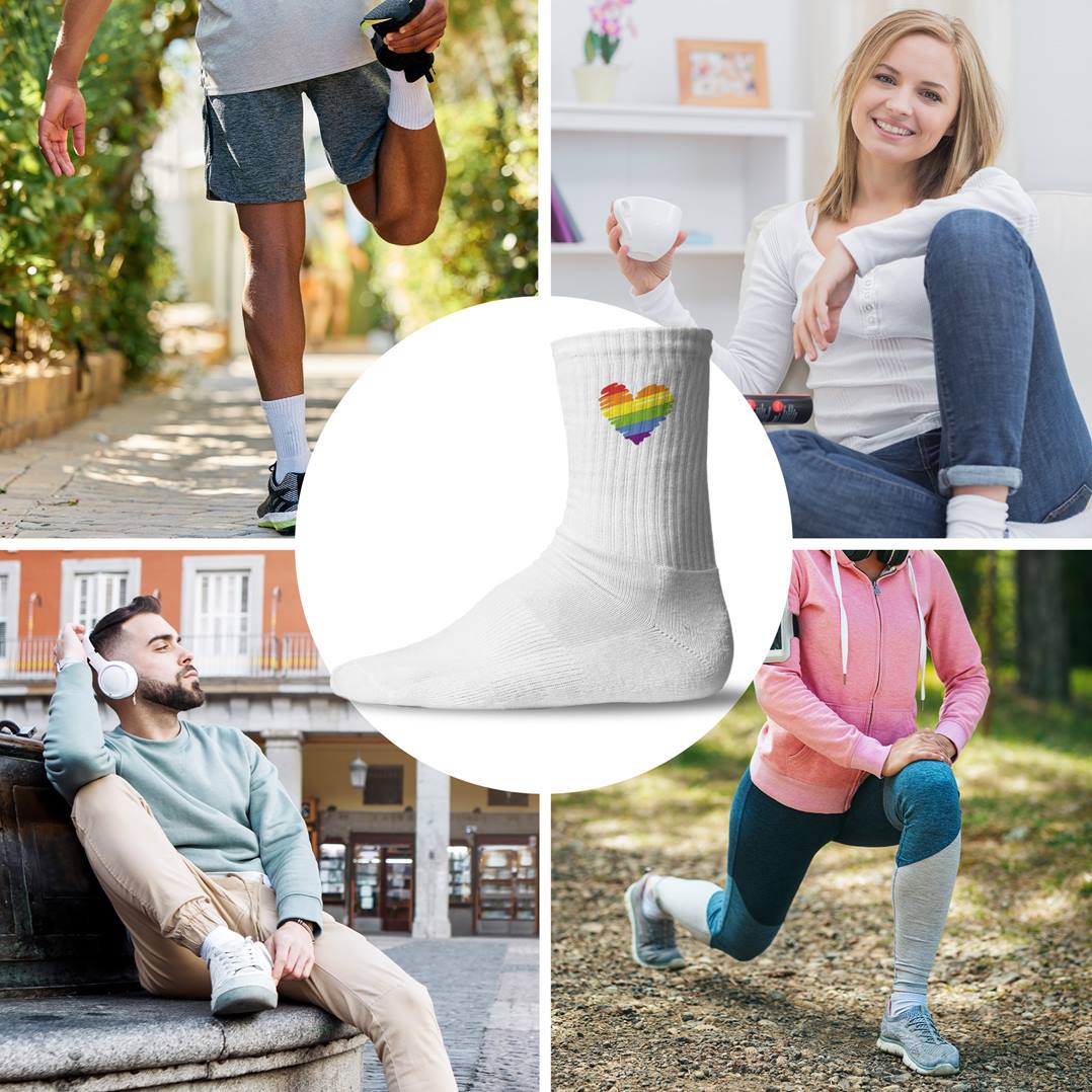 Diese farbenfrohen Tennissocken setzen ein Statement – mit einem leuchtenden Regenbogenherz-Motiv 🌈❤️, das sauber und langlebig per Sublimationsdruck aufgebracht wird. Bequem, atmungsaktiv und robust: perfekt für Sport, Pride-Events oder den Alltag mit Haltung.