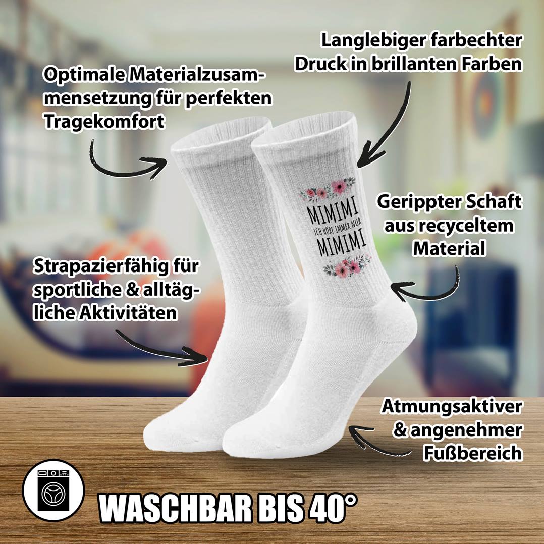 Diese bunten Tennissocken bringen Blütenpracht in deinen Alltag – mit einem detailverliebten Blumenmotiv und dem Spruch „Mimimi – Ich höre immer nur Mimimi“. 🌸 Sauber und langlebig per Sublimationsdruck aufgebracht. Bequem, atmungsaktiv und robust: perfekt für Sport, Freizeit oder einfach zum Entspannen.