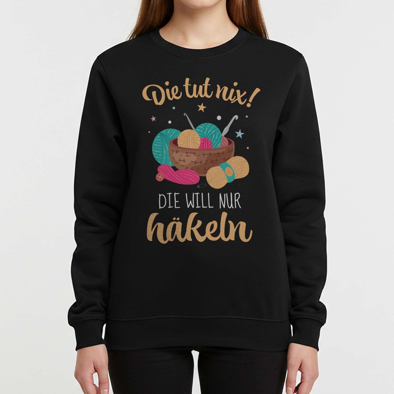 Hochwertiger Pullover mit Motiv und Spruch: Die tut nix! Die will nur häkeln 🧶