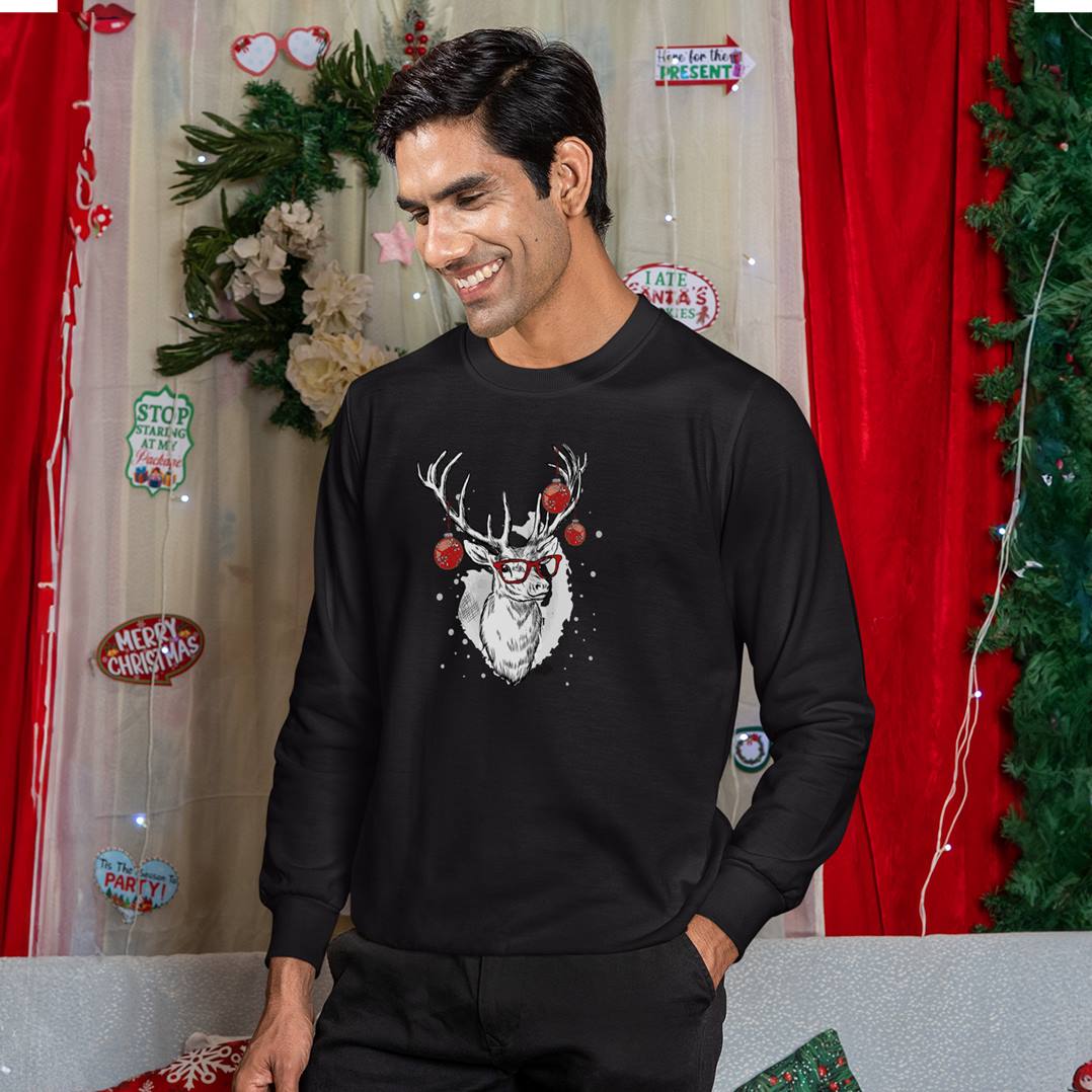 Suchst du ein lustiges Weihnachtsgeschenk, das warmhält und gleichzeitig stylisch aussieht? Dann ist dieser Pullover mit dem coolen Elch-Motiv in Weiß und Rot genau das Richtige für dich! Mit seiner lässigen roten Brille und den Christbaumkugeln im Geweih ist er der perfekte Mix aus Weihnachtsstimmung und Humor – modern, auffällig und einfach richtig cool.
