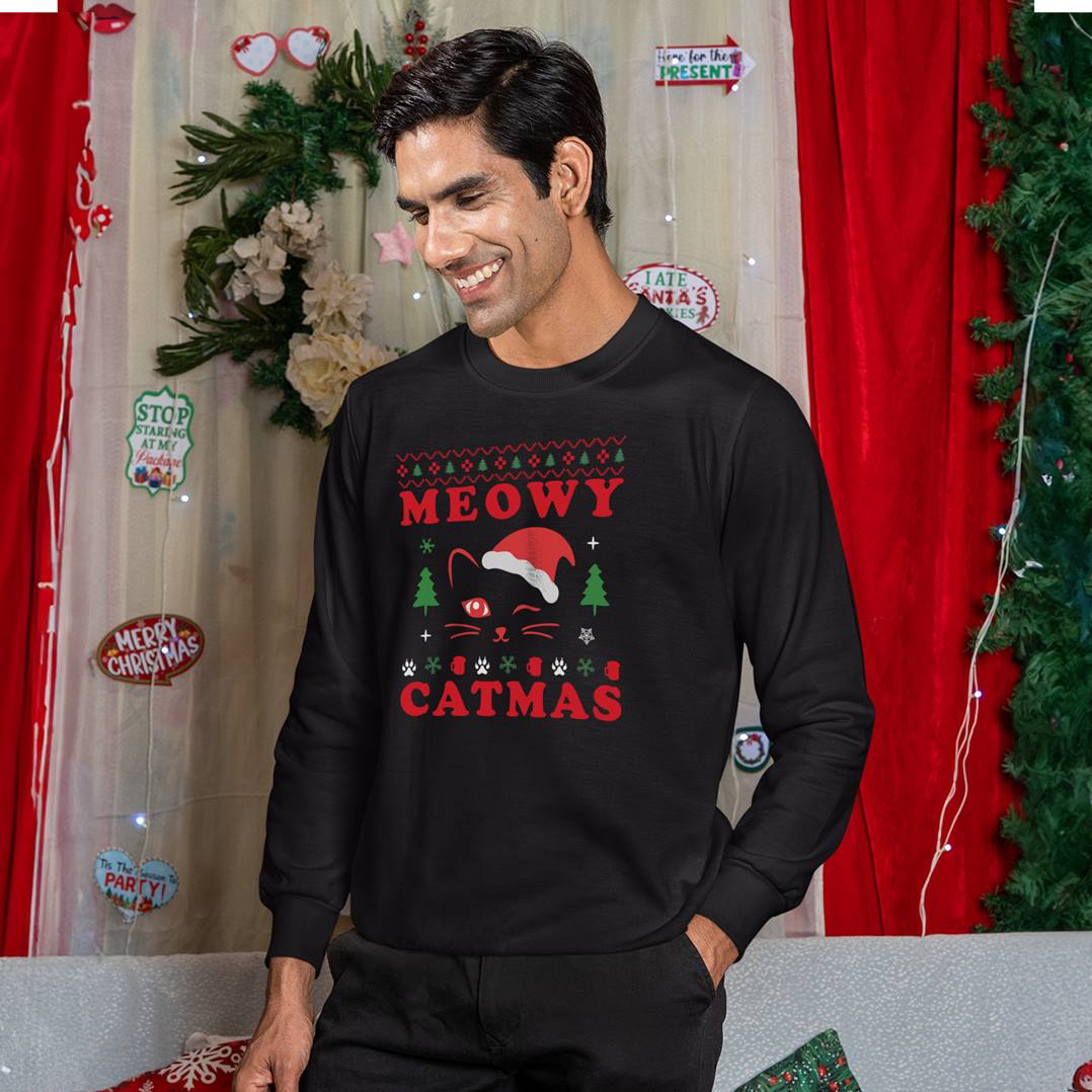 Dann ist dieser Weihnachtspullover mit dem Motiv „Meowy Catmas“ genau das Richtige! Die süße Weihnachtskatze mit Nikolausmütze bringt Humor, Festtagsstimmung und eine große Portion Cuteness unter den Baum.
