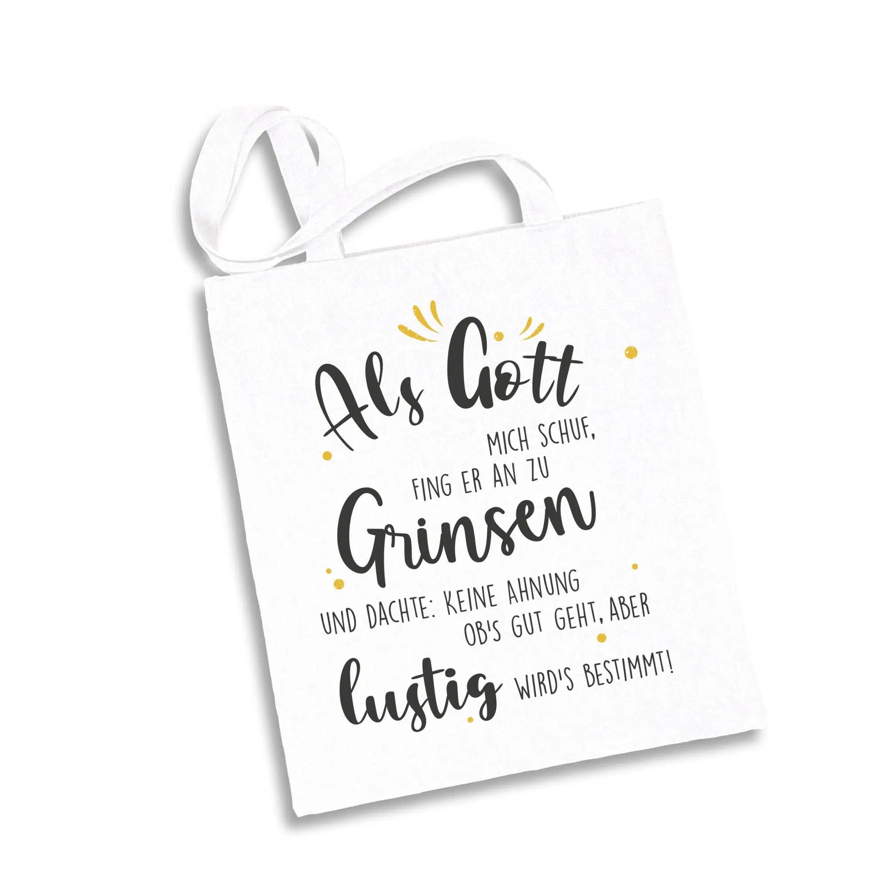 Baumwolltasche (Beutel) mit langen Henkeln und Spruch: Als Gott mich schuf, fing er an zu grinsen und dachte: Keine Ahnung ob´s gut geht, aber lustig wird´s bestimmt!