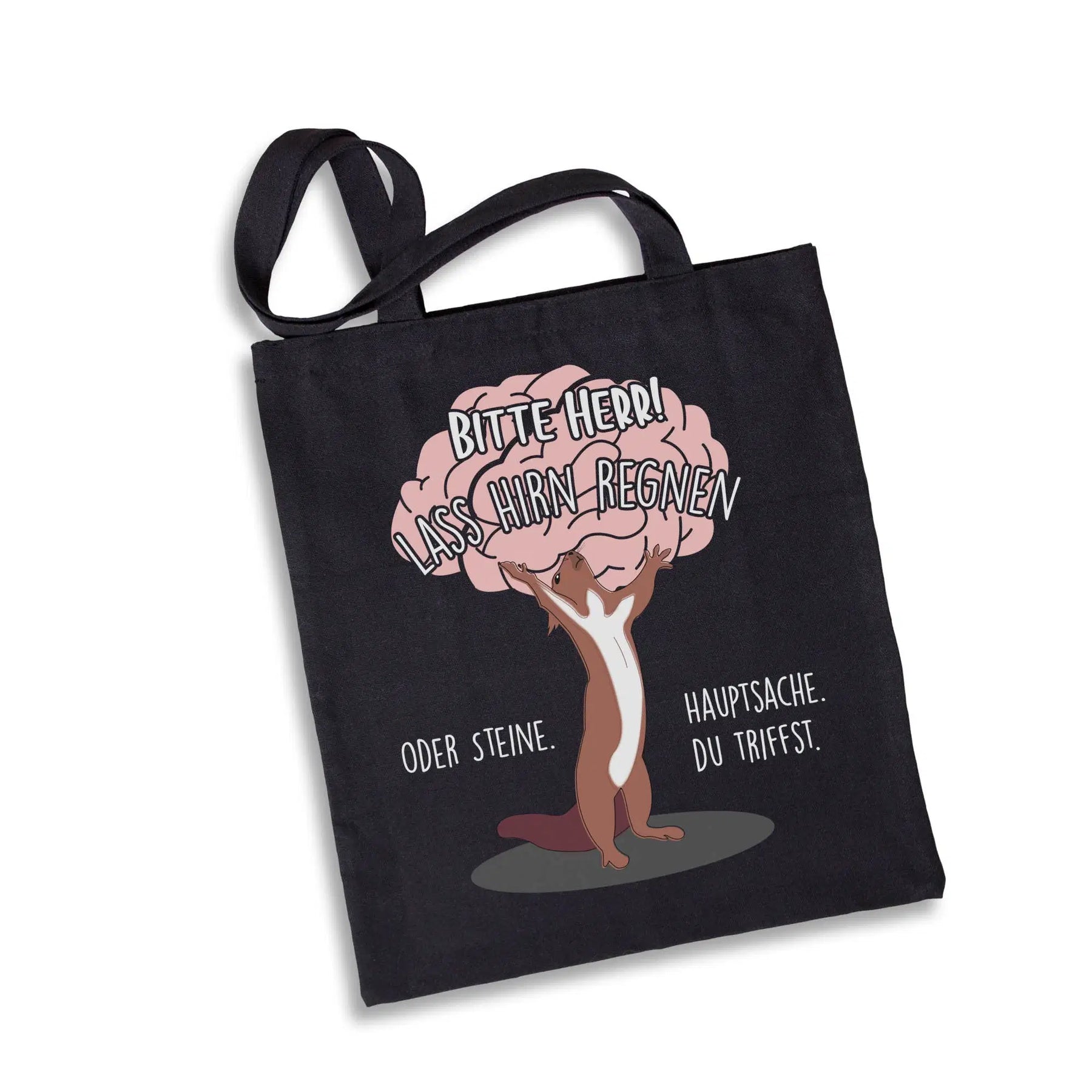 Baumwolltasche (Beutel) mit langen Henkeln und Spruch: Bitte Herr! Lass Hirn Regnen oder Steine. Hauptsache Du triffst. 🐿️
