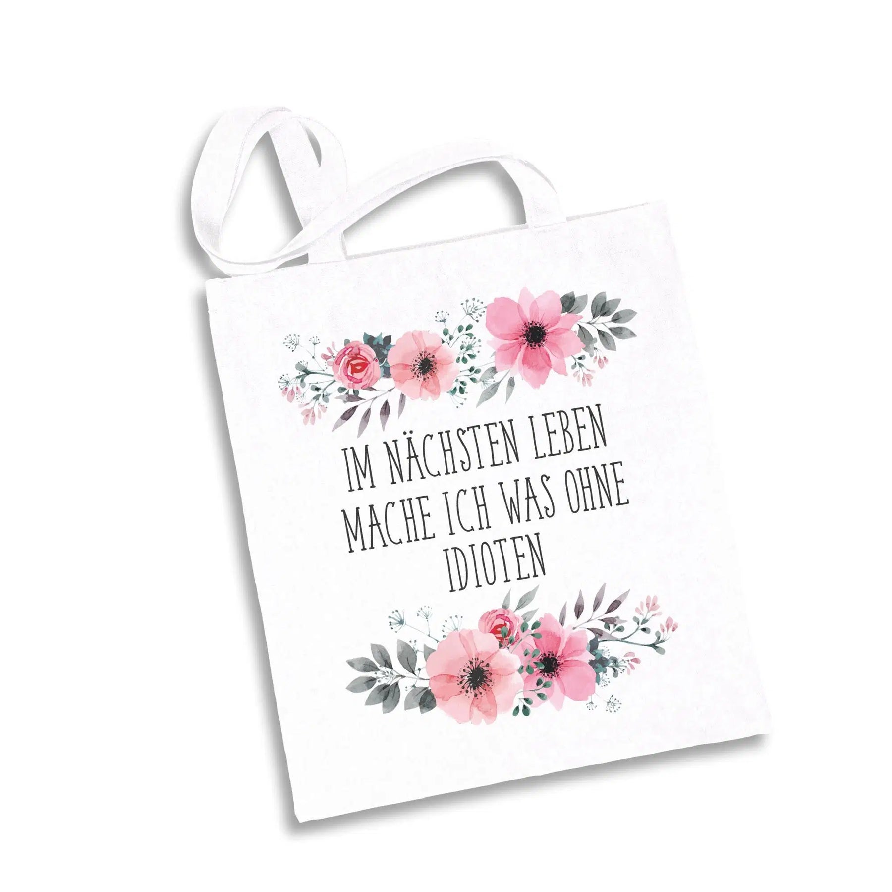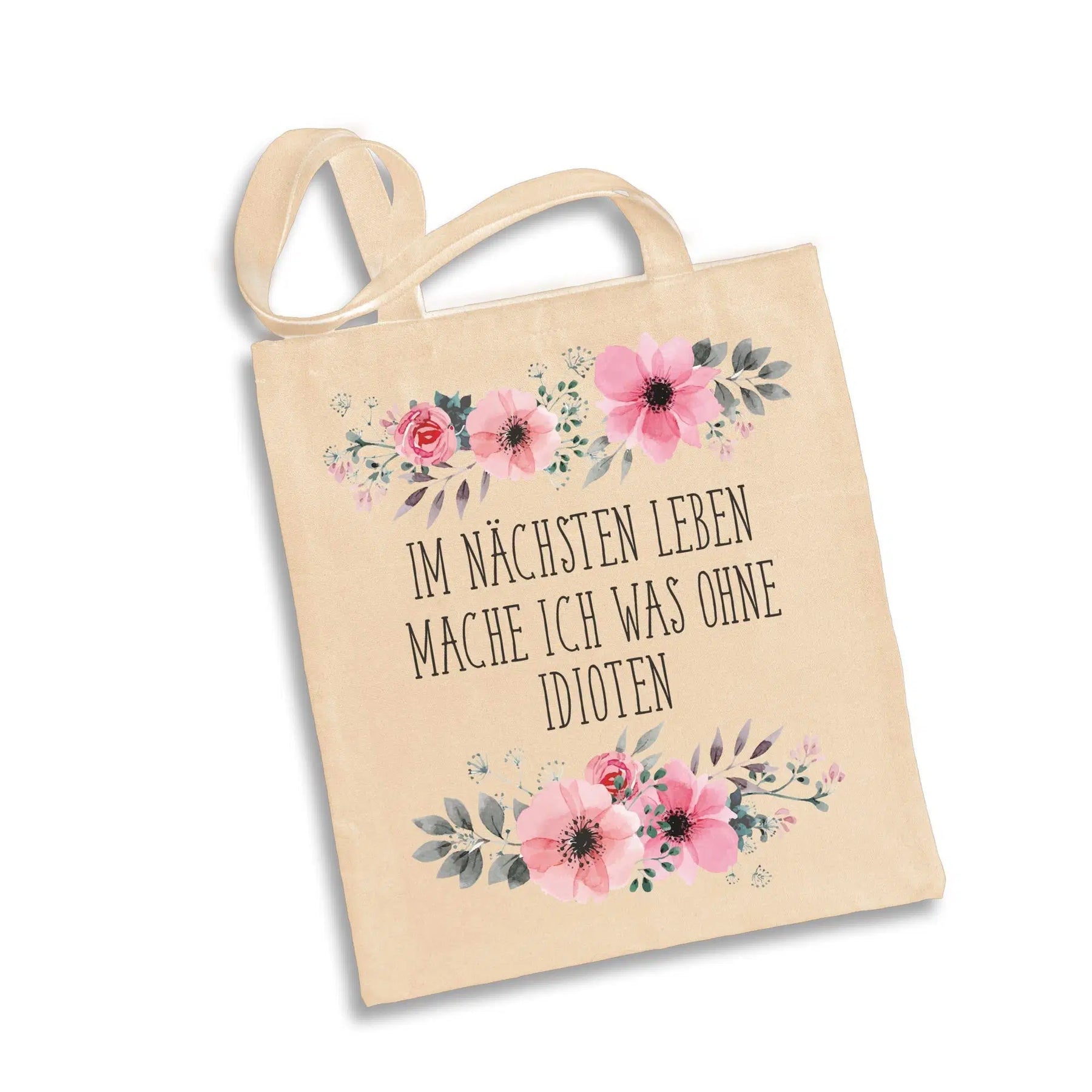 Blümchen-Baumwolltasche (Beutel) 🌸 mit langen Henkeln und Spruch: Im nächsten Leben mache ich was ohne Idioten
