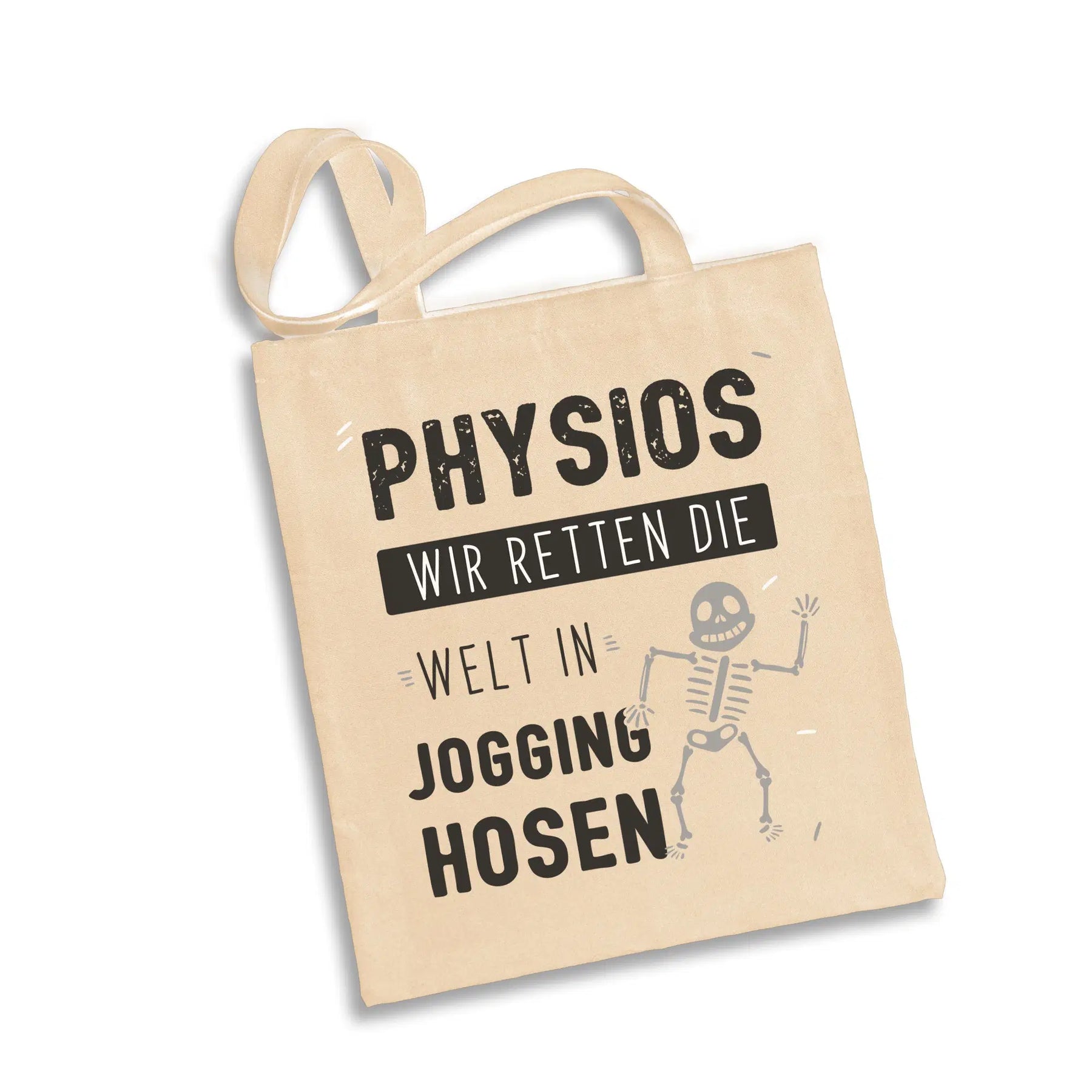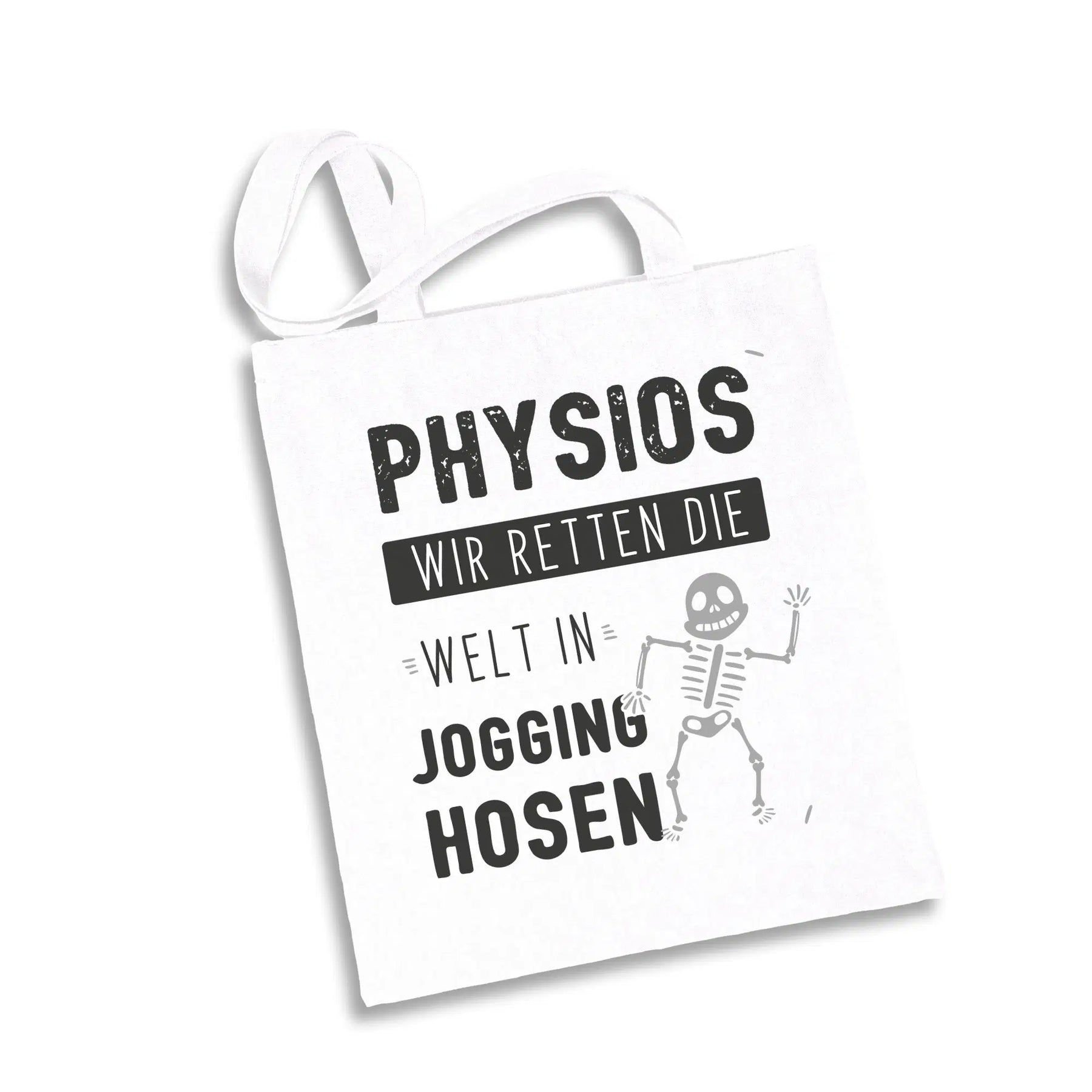 Baumwolltasche mit langen Henkeln und Spruch für Physiotherapeuten: Physios - Wir retten die Welt in Jogging-Hosen 💀​🦴​