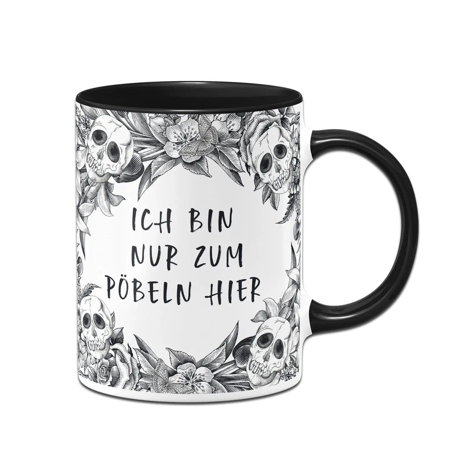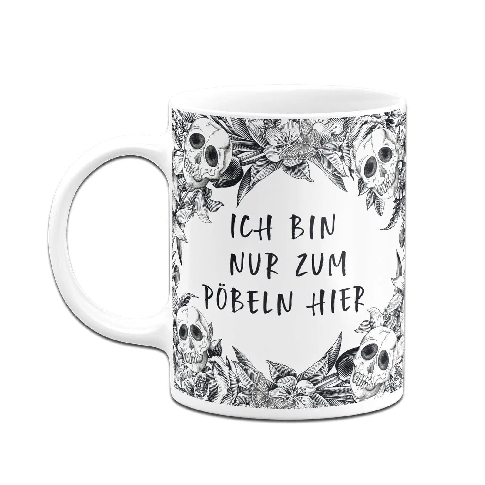 Skull Statement 💀 Totenkopf Tasse mit Spruch: Ich bin nur zum Pöbeln hier (im Rundumdruck)