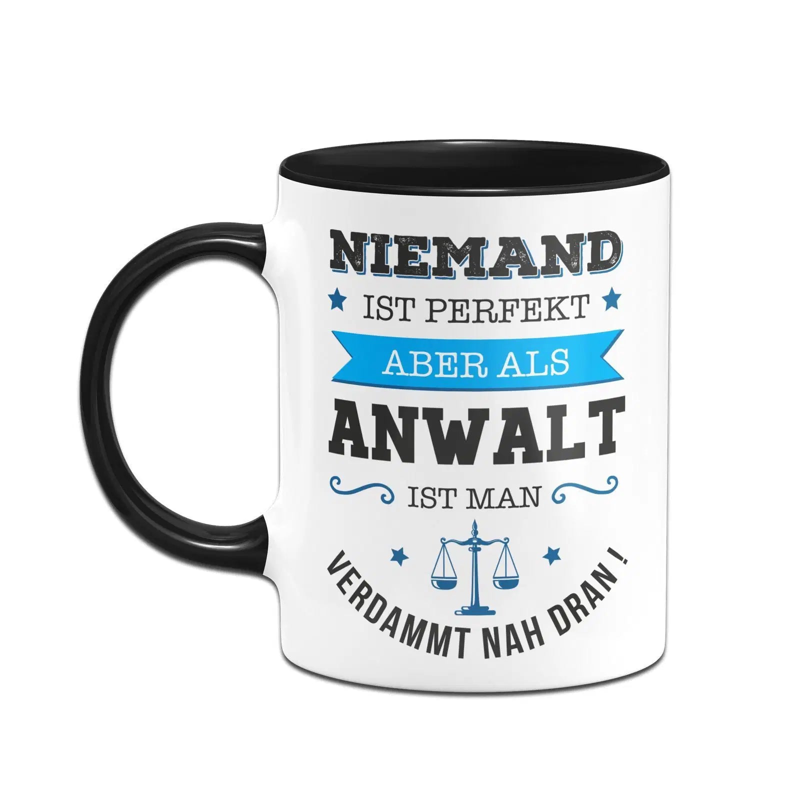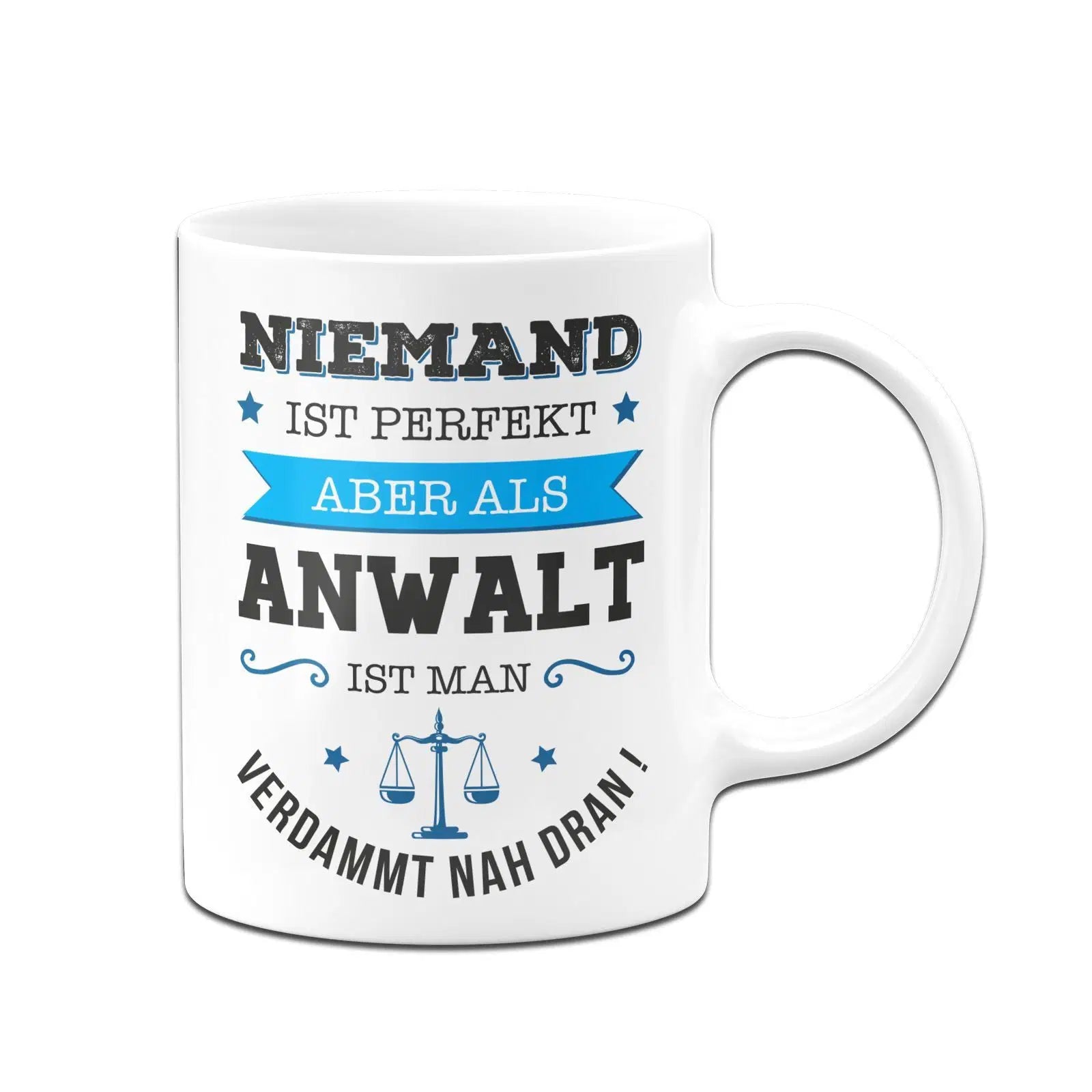Tasse mit spruch: Niemand ist perfekt aber als Anwalt ist man verdammt nah dran! ⭐